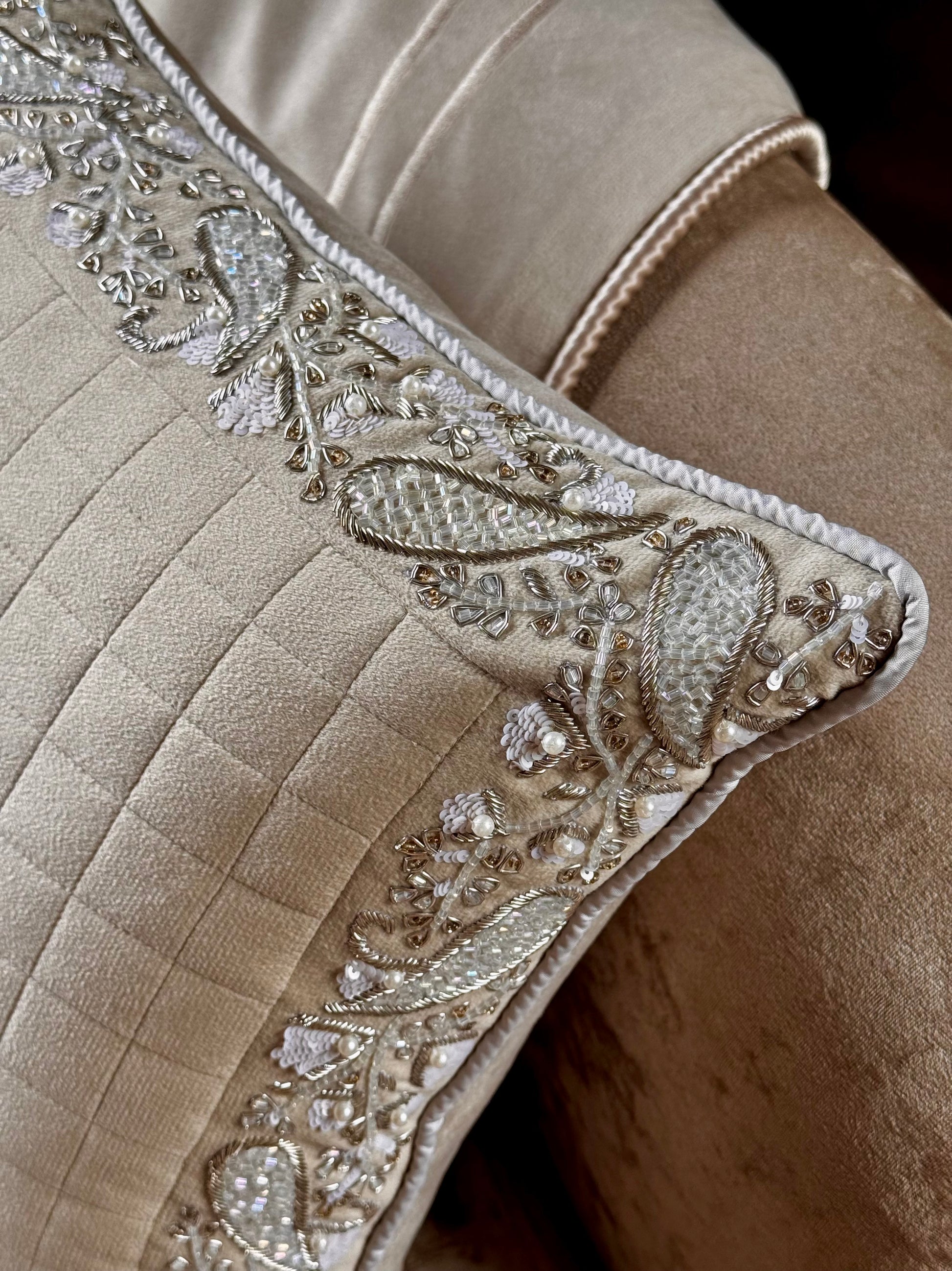 Radiating quiet opulence, the Noor Cushion Cover is a celebration of timeless craftsmanship and delicate beauty. Made from ultra-soft suede fabric, it features exquisite hand embroidery adorned with dabka work, fine beads, and intricate thread detailing — creating a luminous border that shimmers with grace.