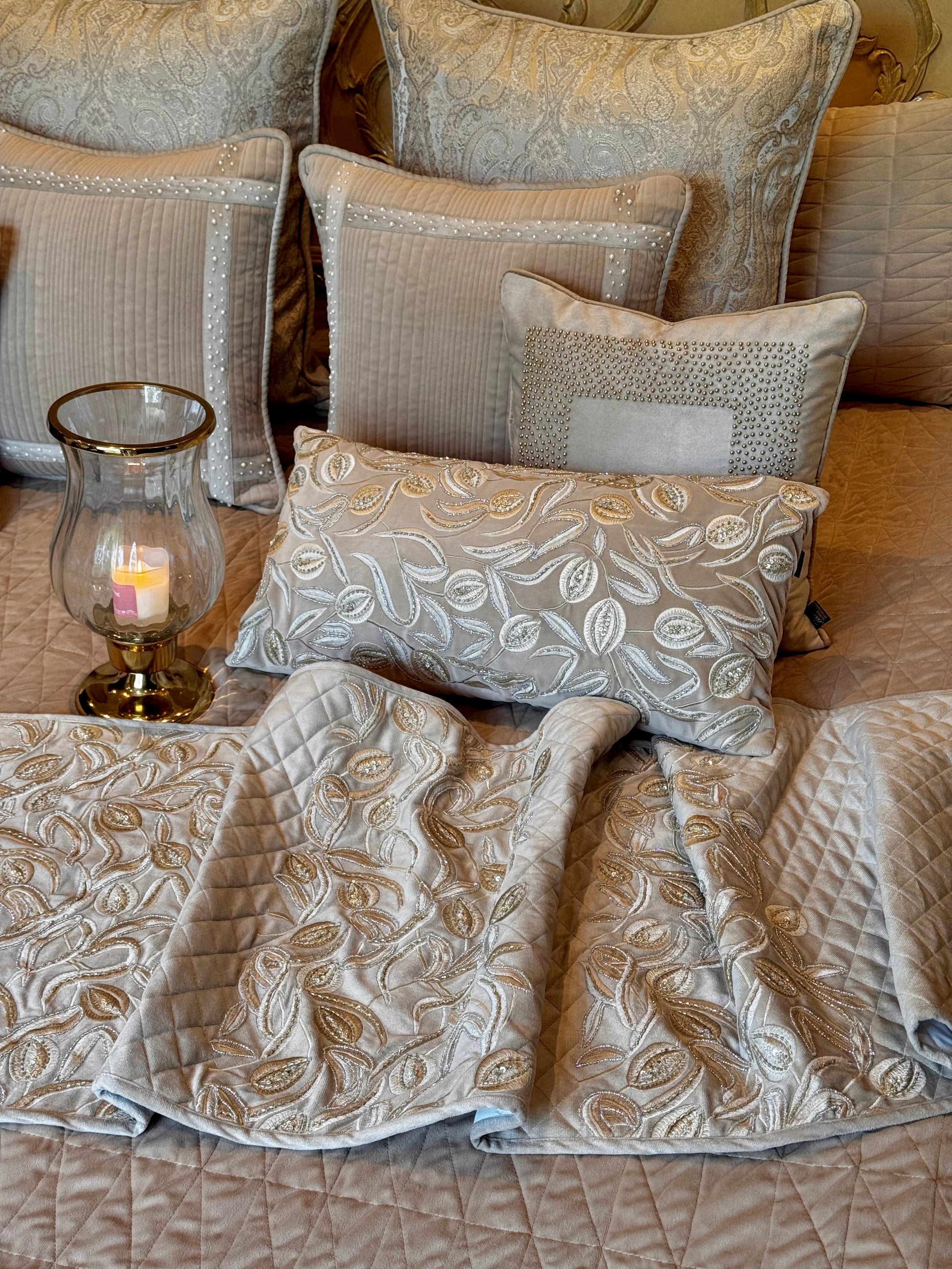 Bring timeless elegance into your space with the Champagne Royale Bedding Set. Crafted in soft, quilted textures with a sophisticated champagne hue, this set is adorned with intricate hand embroidery, delicate beadwork, and luxurious detailing. The carefully coordinated cushions add depth and richness, blending paisley motifs, linear quilting, and graceful vine embroidery. Perfect for those who appreciate understated glamour and refined craftsmanship, this set transforms any bedroom into a serene, regal retreat.