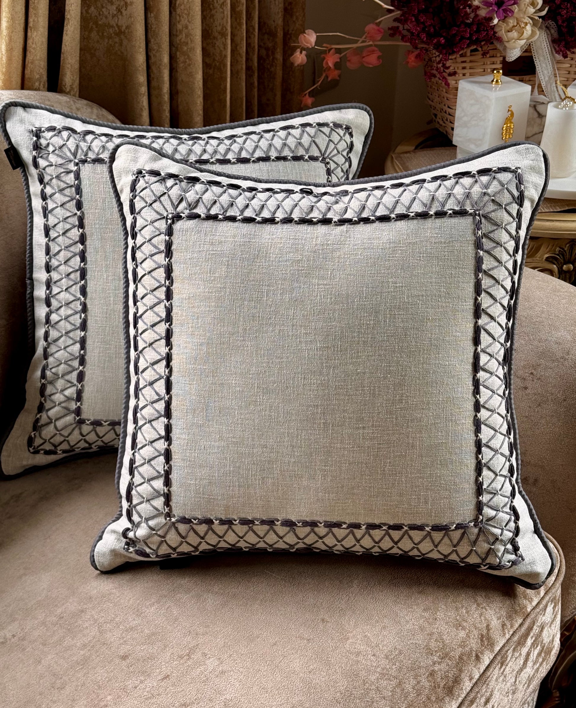 Add a touch of timeless charm to your home with this handcrafted cross-stitch cushion cover, made from a soft and durable linen-cotton blend. Designed with an elegant neutral base, it features delicate crisscross embroidery in a deep, contrasting thread — a beautiful nod to heritage handcraft.