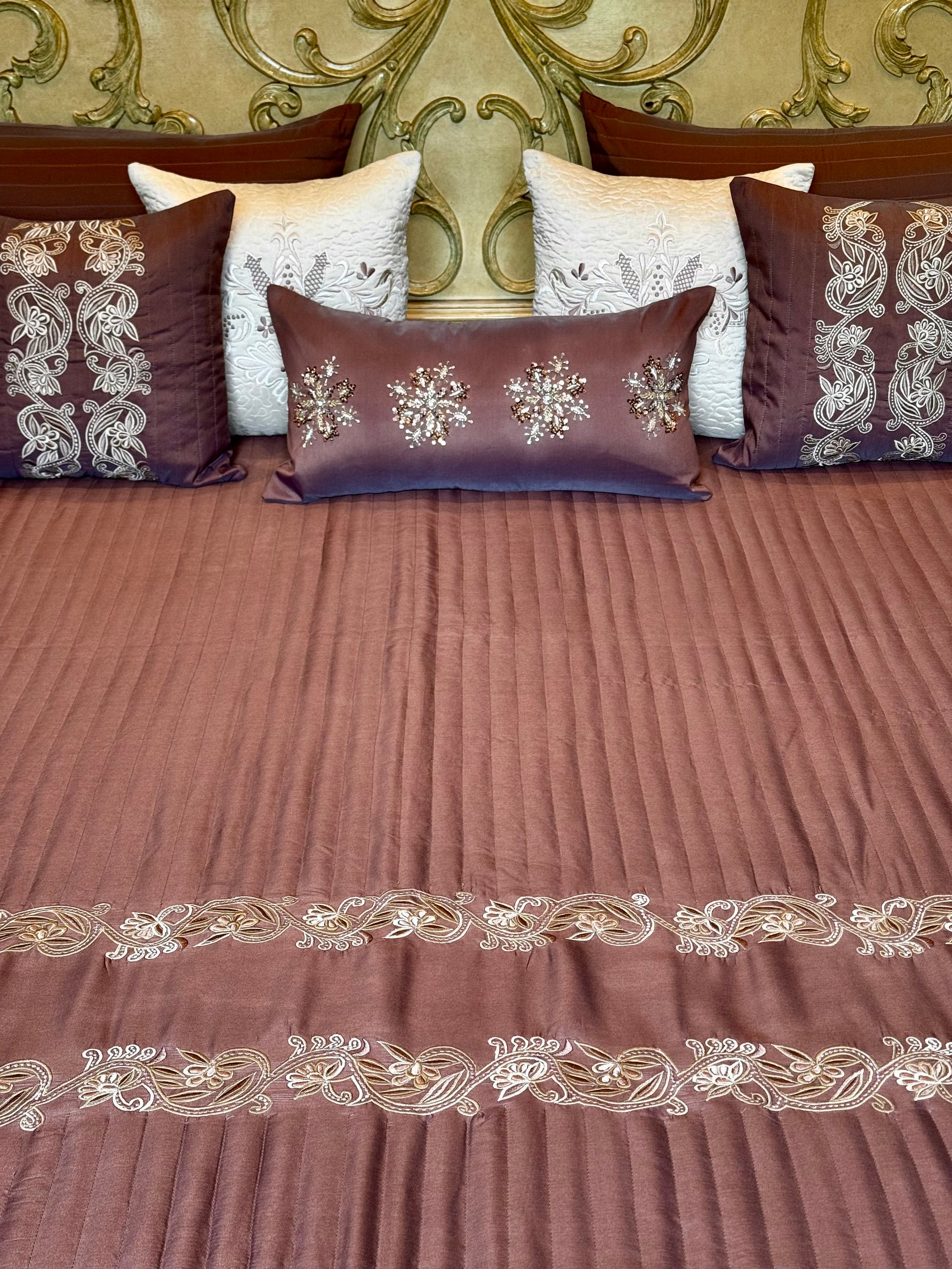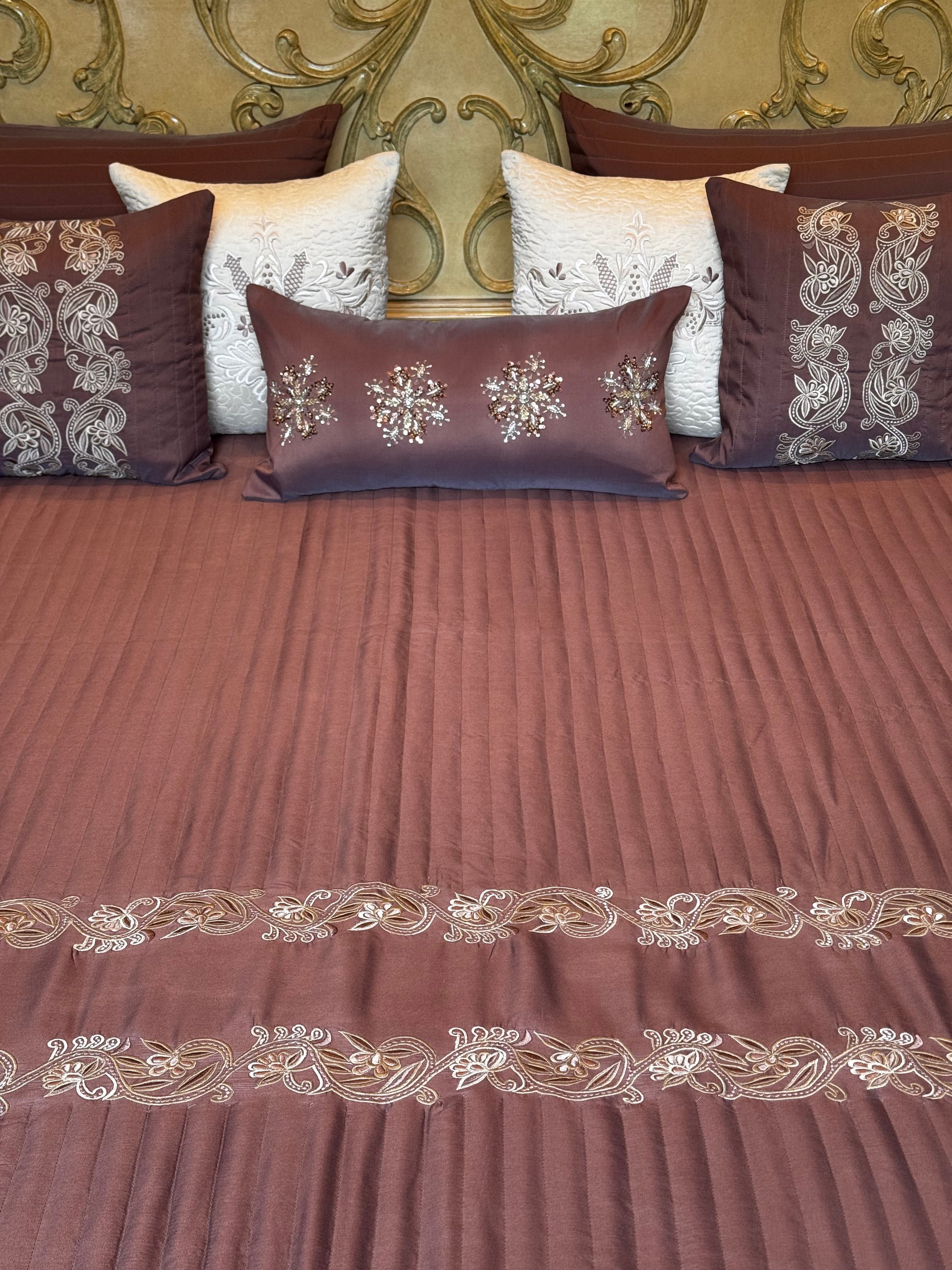 The finely pleated texture adds structure and sophistication, while the embroidered border and coordinated cushions lend a regal charm to the overall ensemble. Highlighted by a statement lumbar pillow with embellished floral motifs, Cocoa Fleur is the perfect blend of tradition and modern luxury.