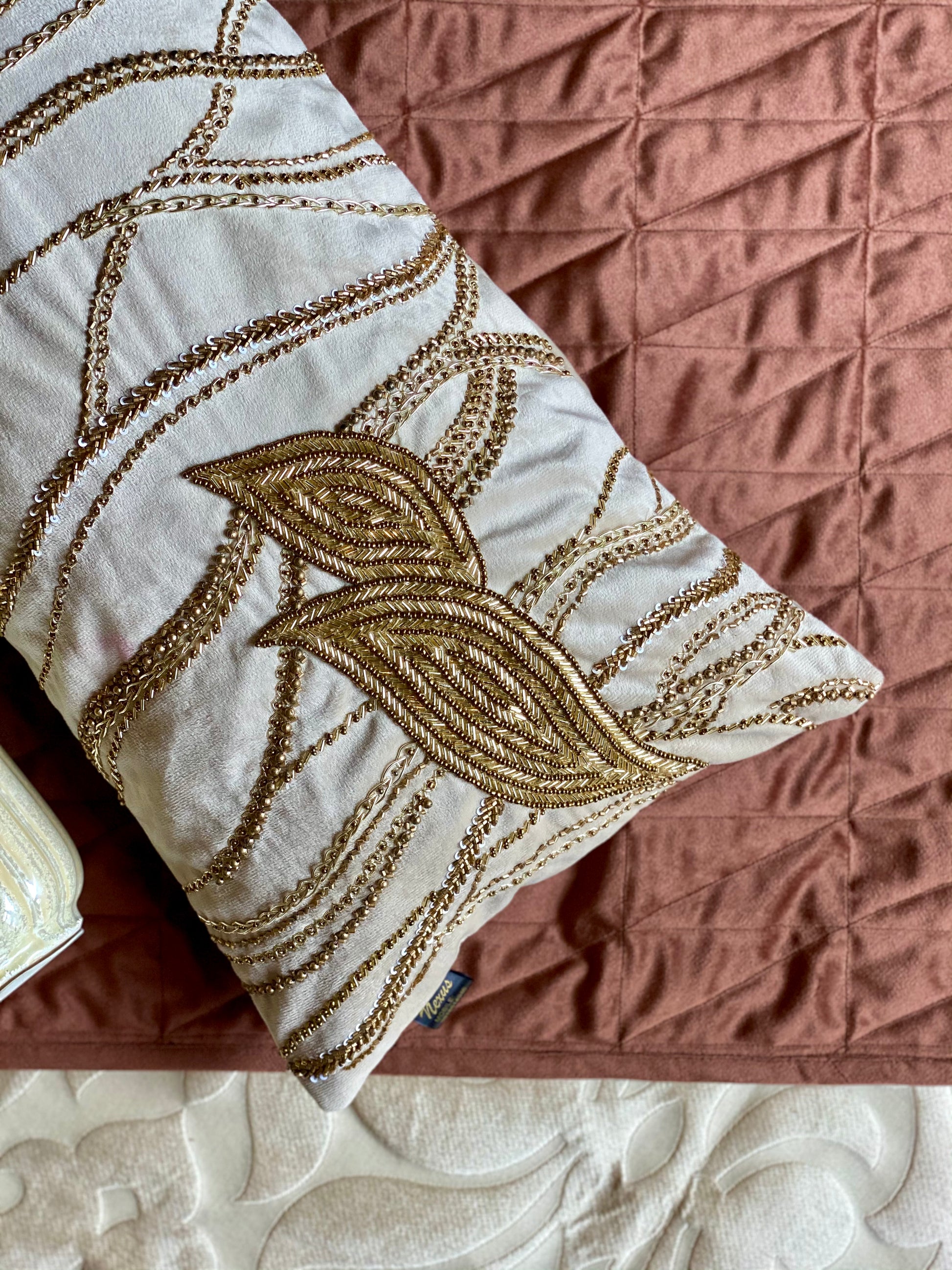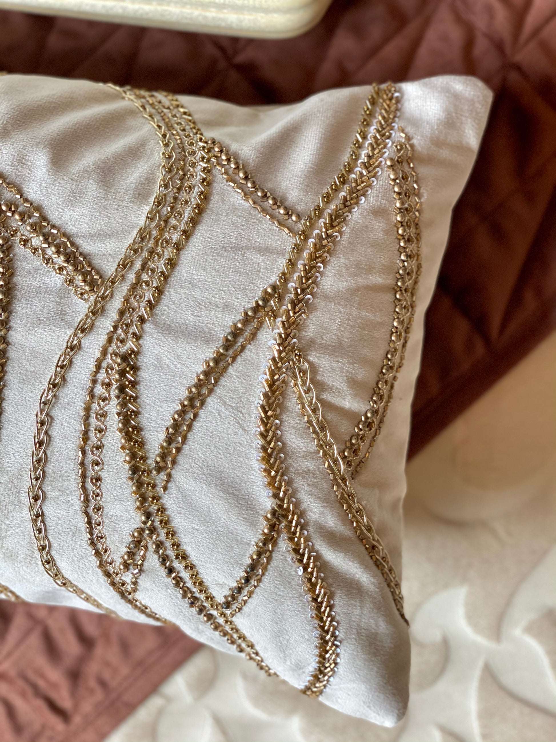 Experience modern luxury with The Beige Maze Spine. This cushion is crafted with beige and gold hand work, and is finished with a soft suede fabric. Enjoy superior support with this unique design, and celebrate your homes like never before.