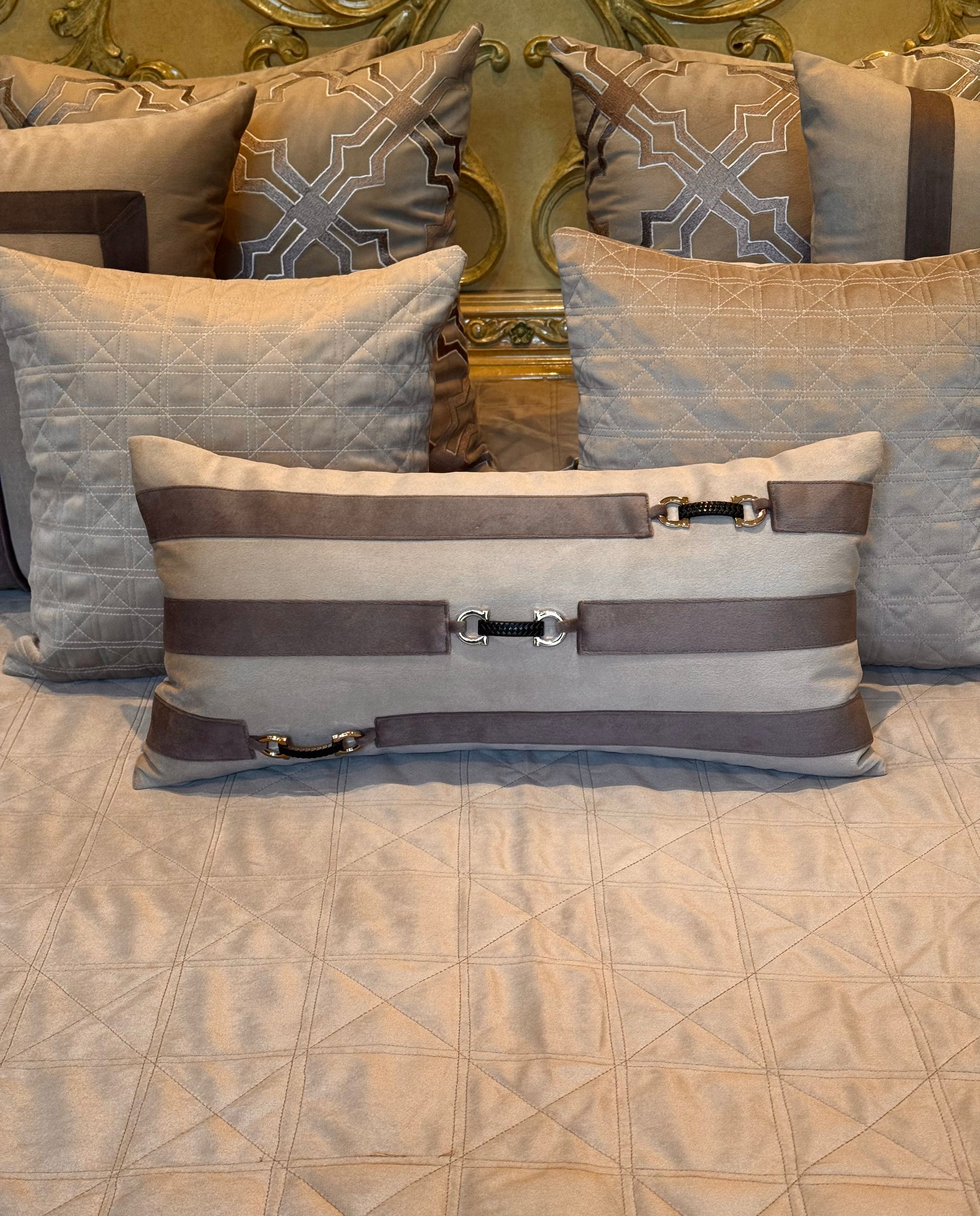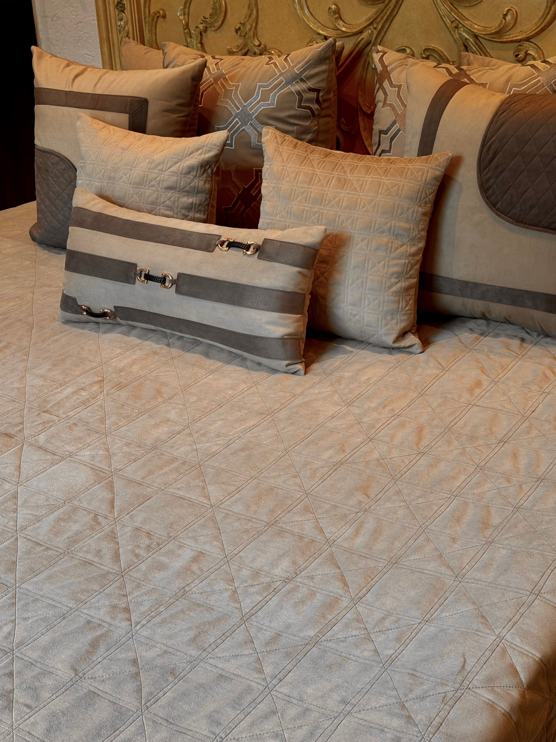 Transform your bedroom into a luxurious retreat with THE BEIGE MERKABA BEDDING SET. This set boasts a soft suede material and modern cushions for a sophisticated and elegant look. Elevate your bedroom decor with this elaborate and stylish bedding set.