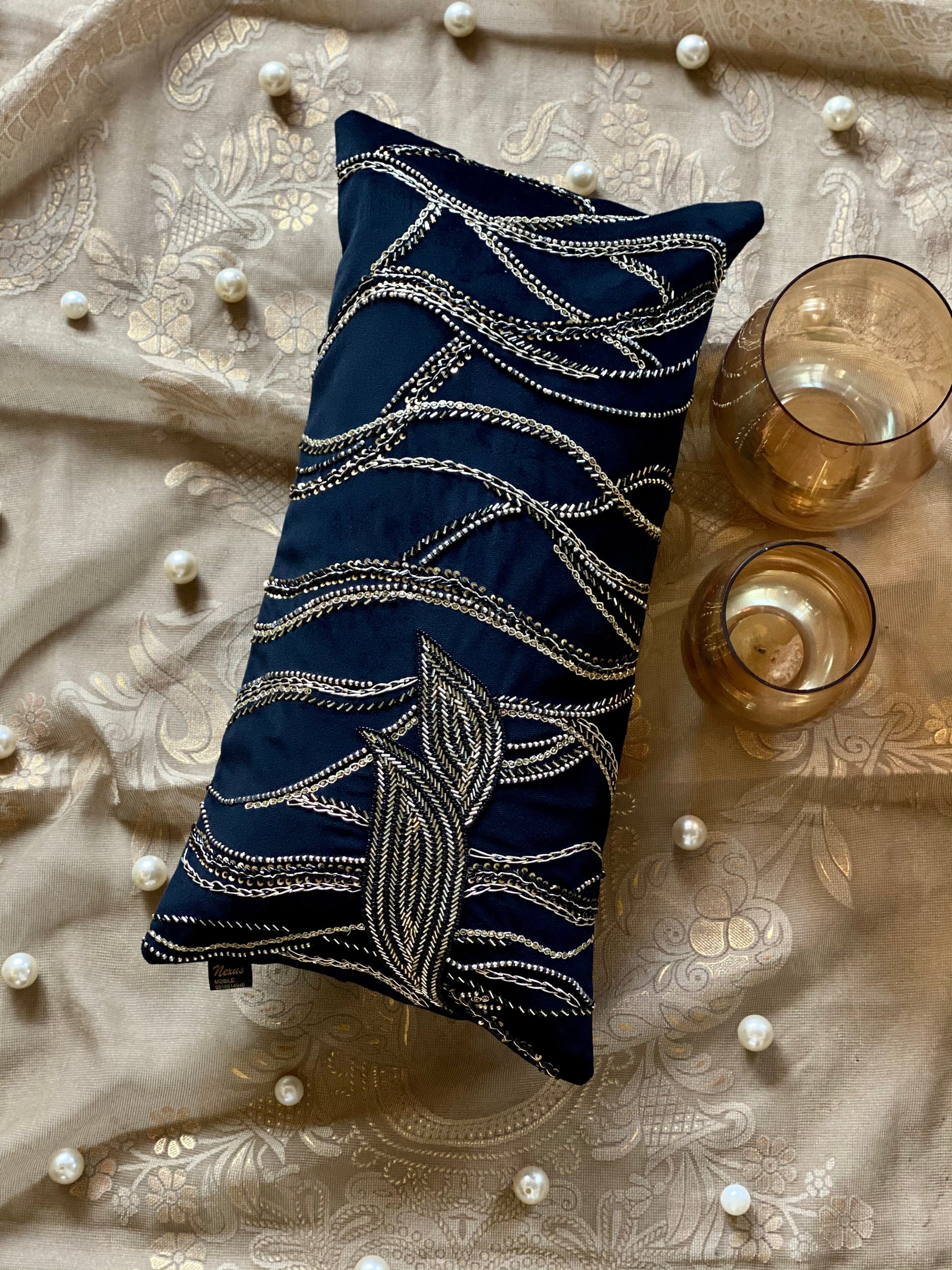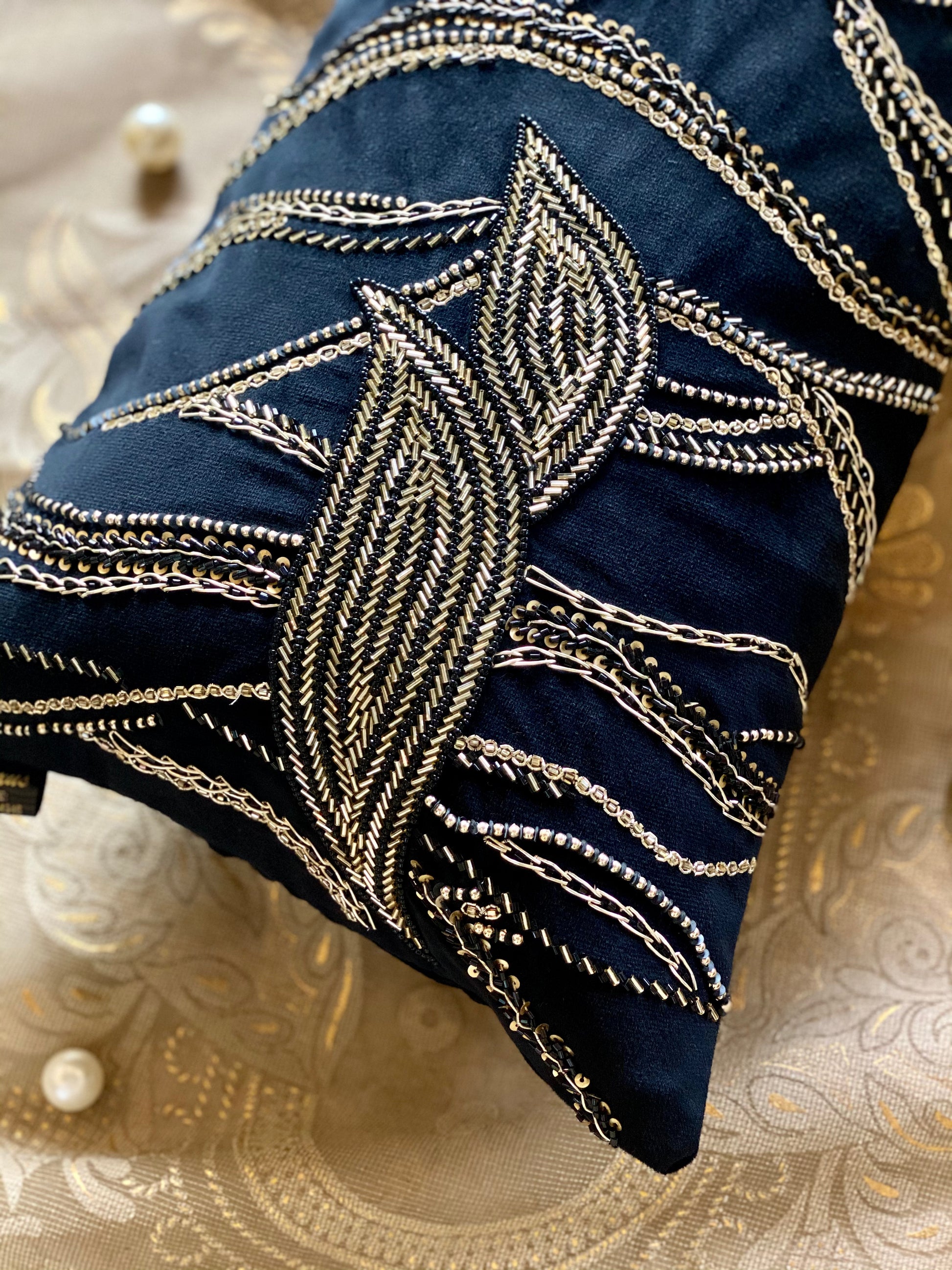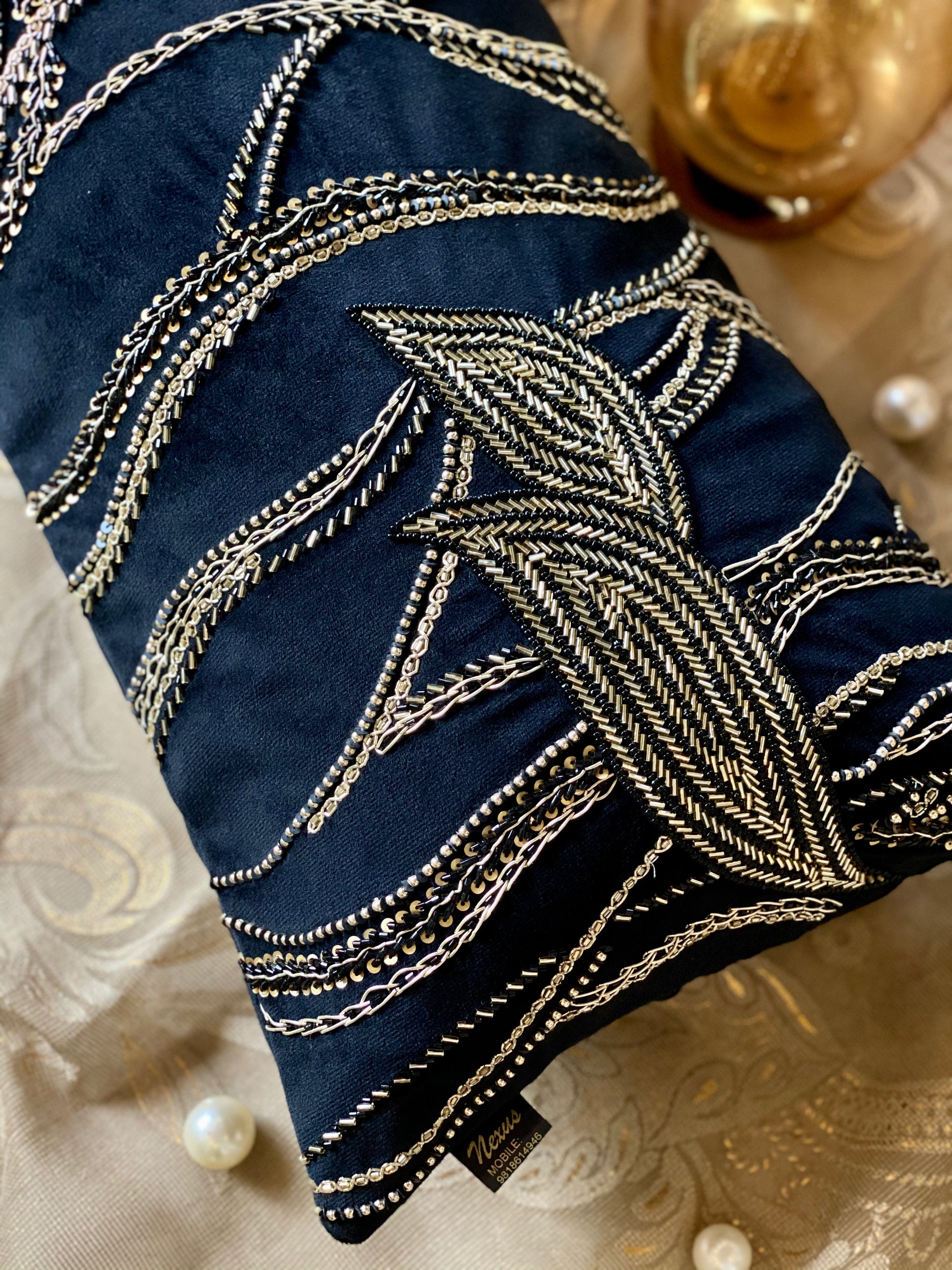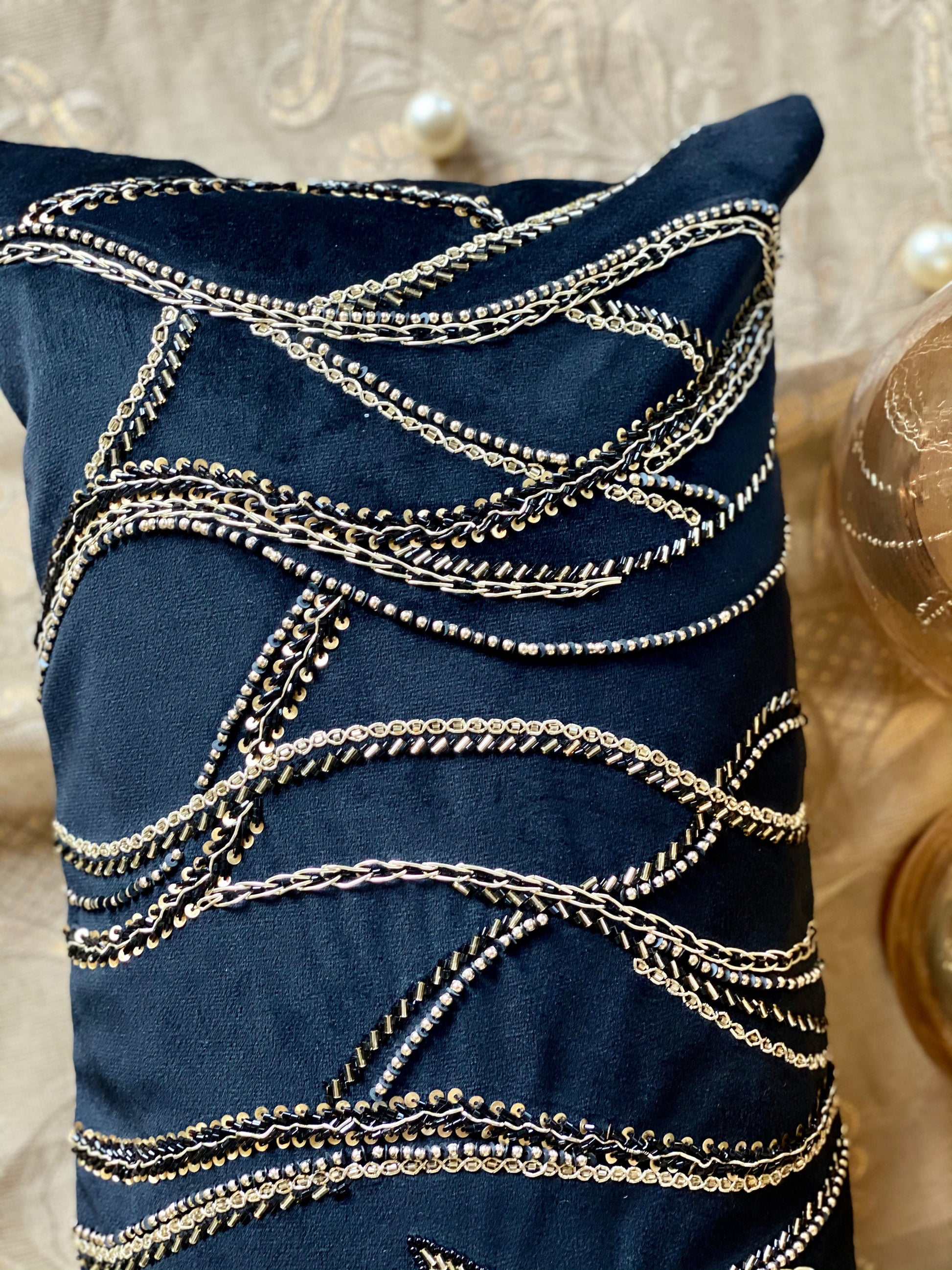 Experience modern luxury with The Black Maze Spine. This cushion is crafted with black and gold hand work, and is finished with a soft suede fabric. Enjoy superior support with this unique design, and celebrate your homes like never before.