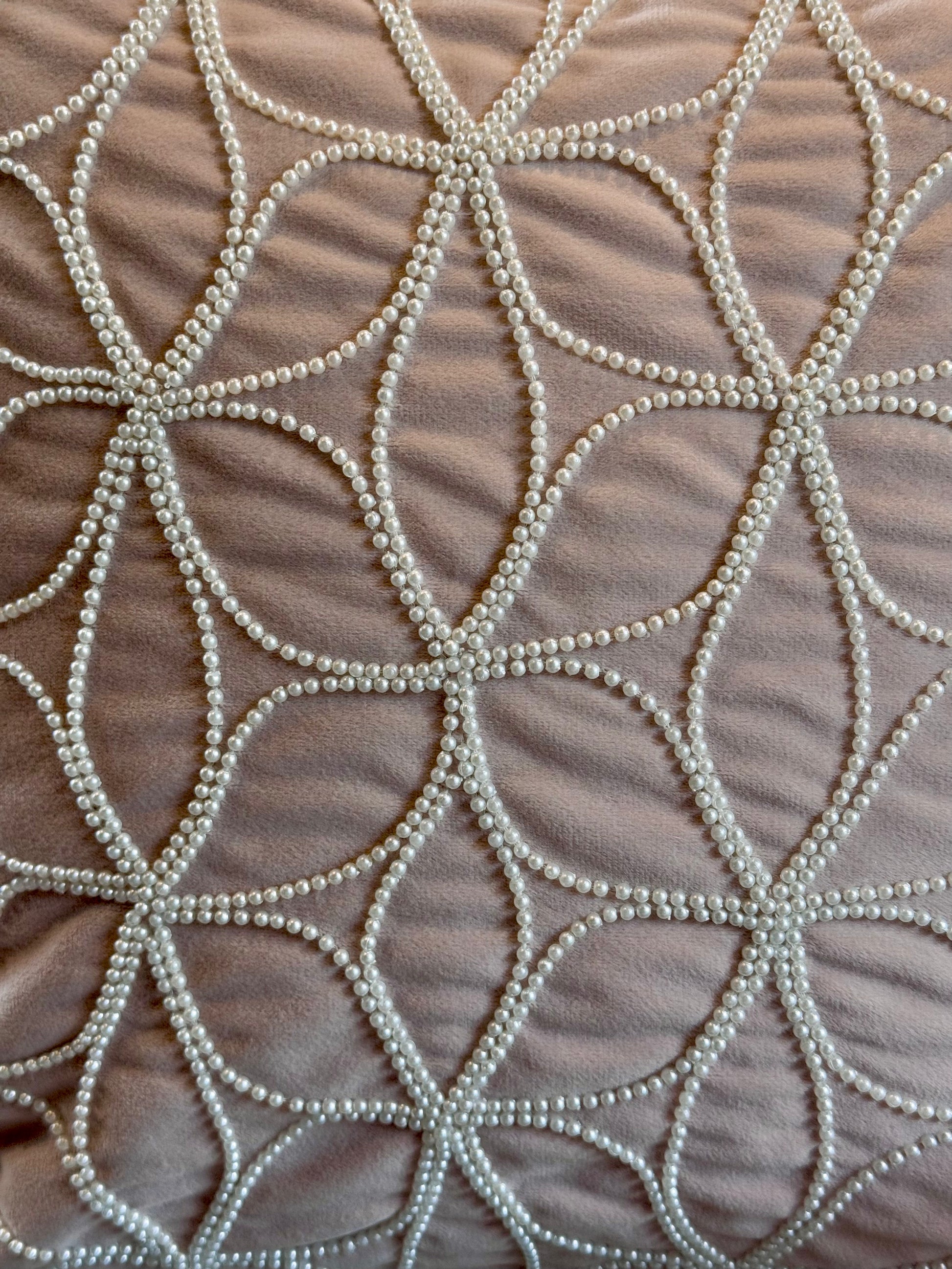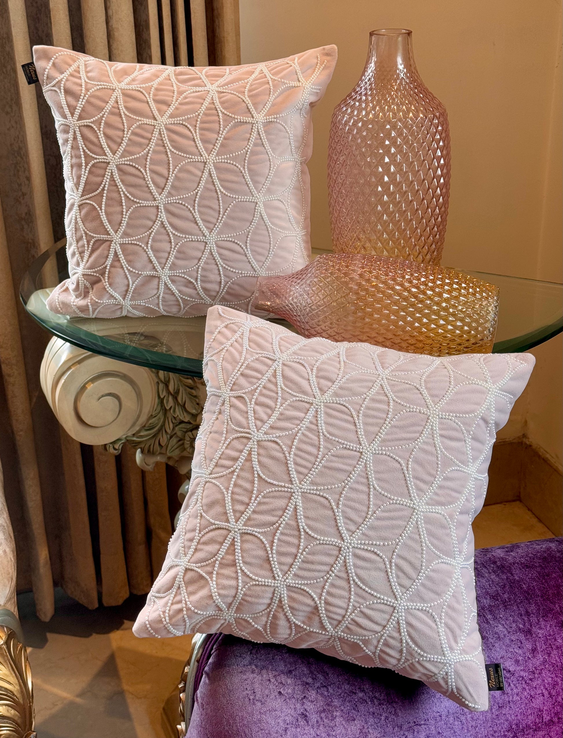 Expertly crafted with a soft blush color and adorned with gorgeous pearl work, THE BLUSH PINK FLORET CUSHION adds a subtle and pretty touch to any room. Its delicate design and high-quality material make it a must-have for any home. Elevate your decor with this elegant and luxurious cushion.