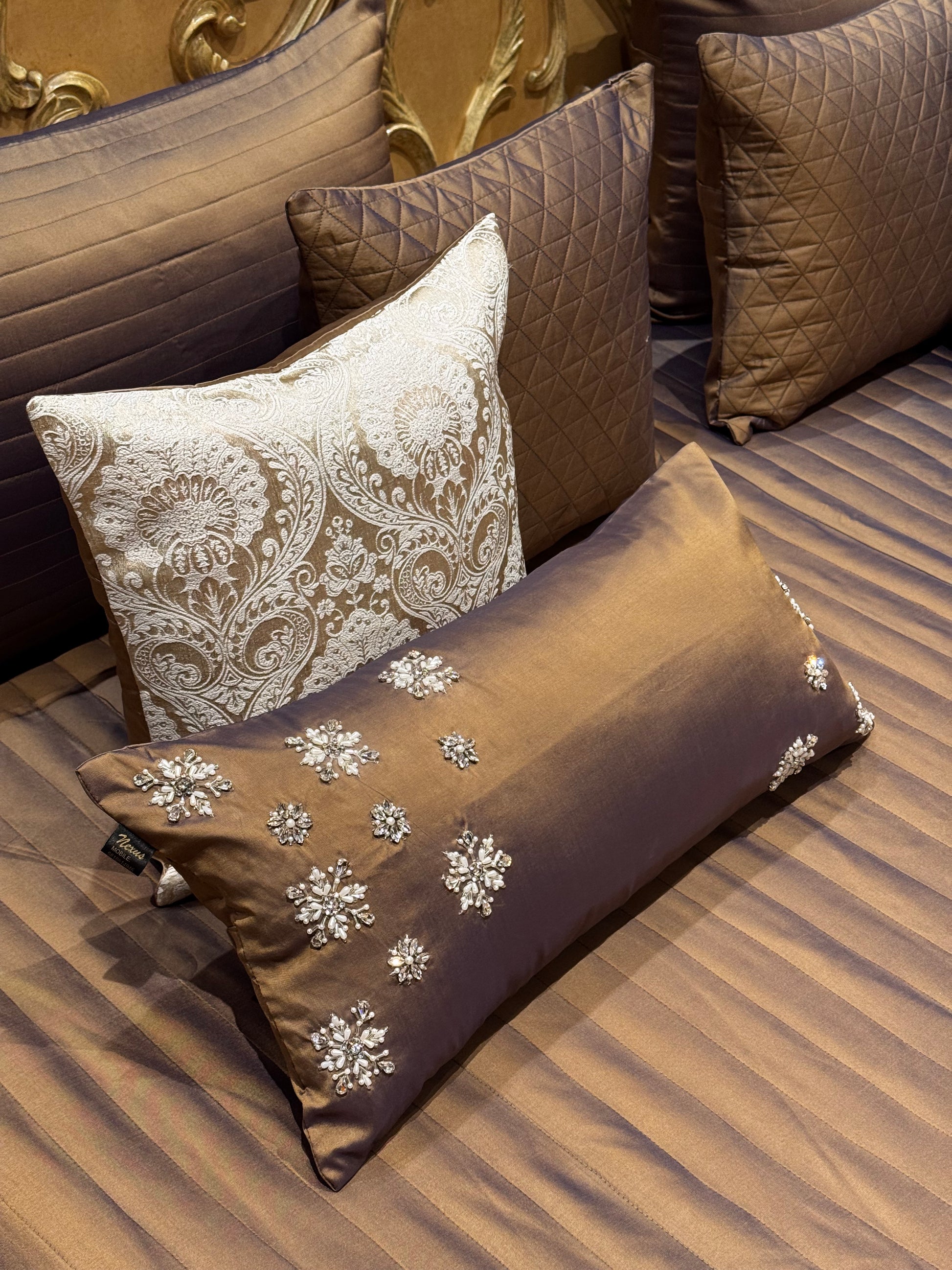 Indulge in luxury with THE GOLD BROWN GARDEN SET. This elegant bedding set features soft gold & brown tones and a stunning crystal hand-embroidered lumbar for a touch of glamour. Transform your bedroom into a serene oasis and sleep in style with this gorgeous set.