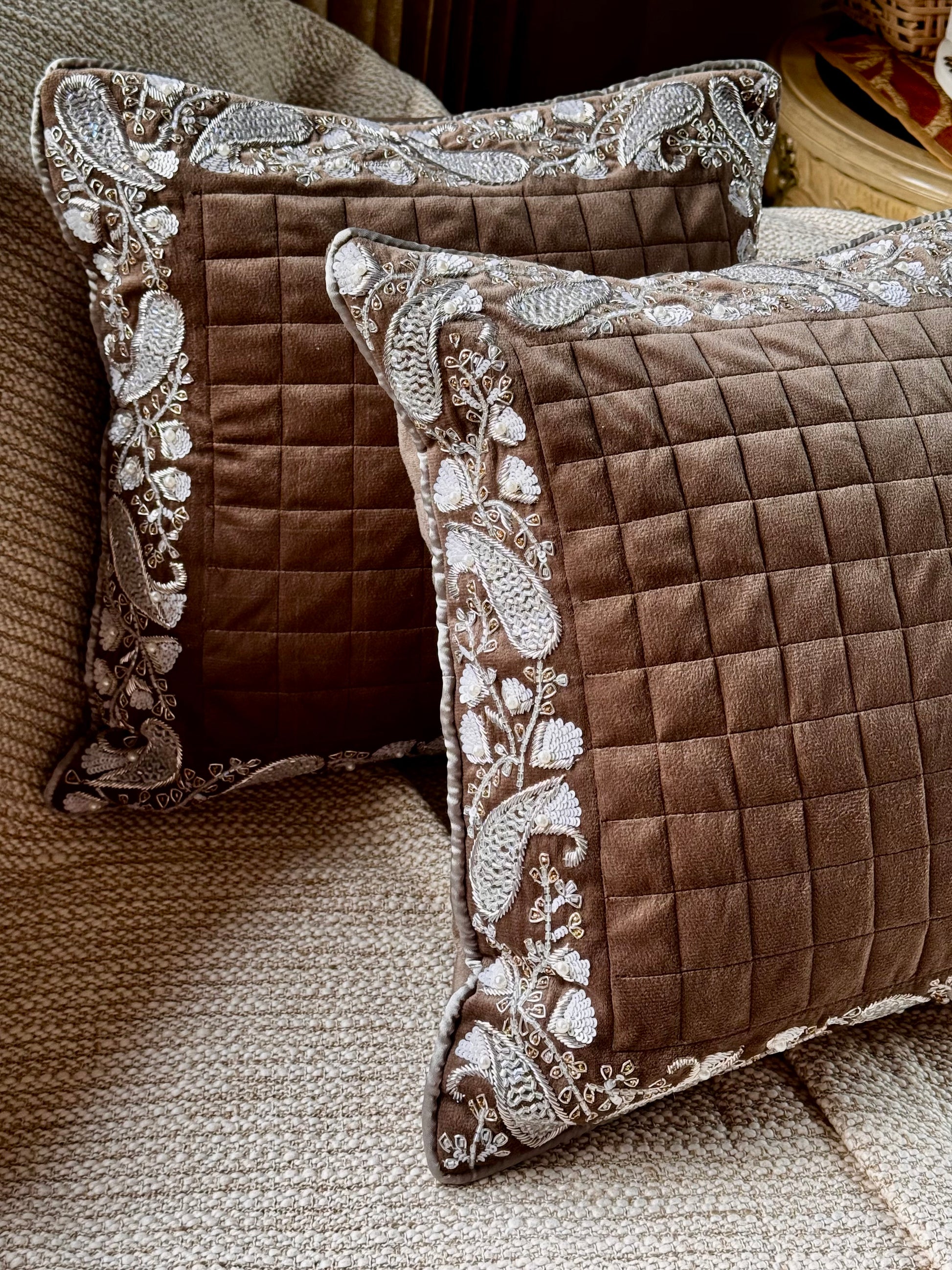 The structured quilted center contrasts beautifully with the ornate edges, making this piece a refined statement for any luxe interior. Style it on your sofa, accent chair, or bed to infuse your space with texture, elegance, and a hint of traditional artistry.
