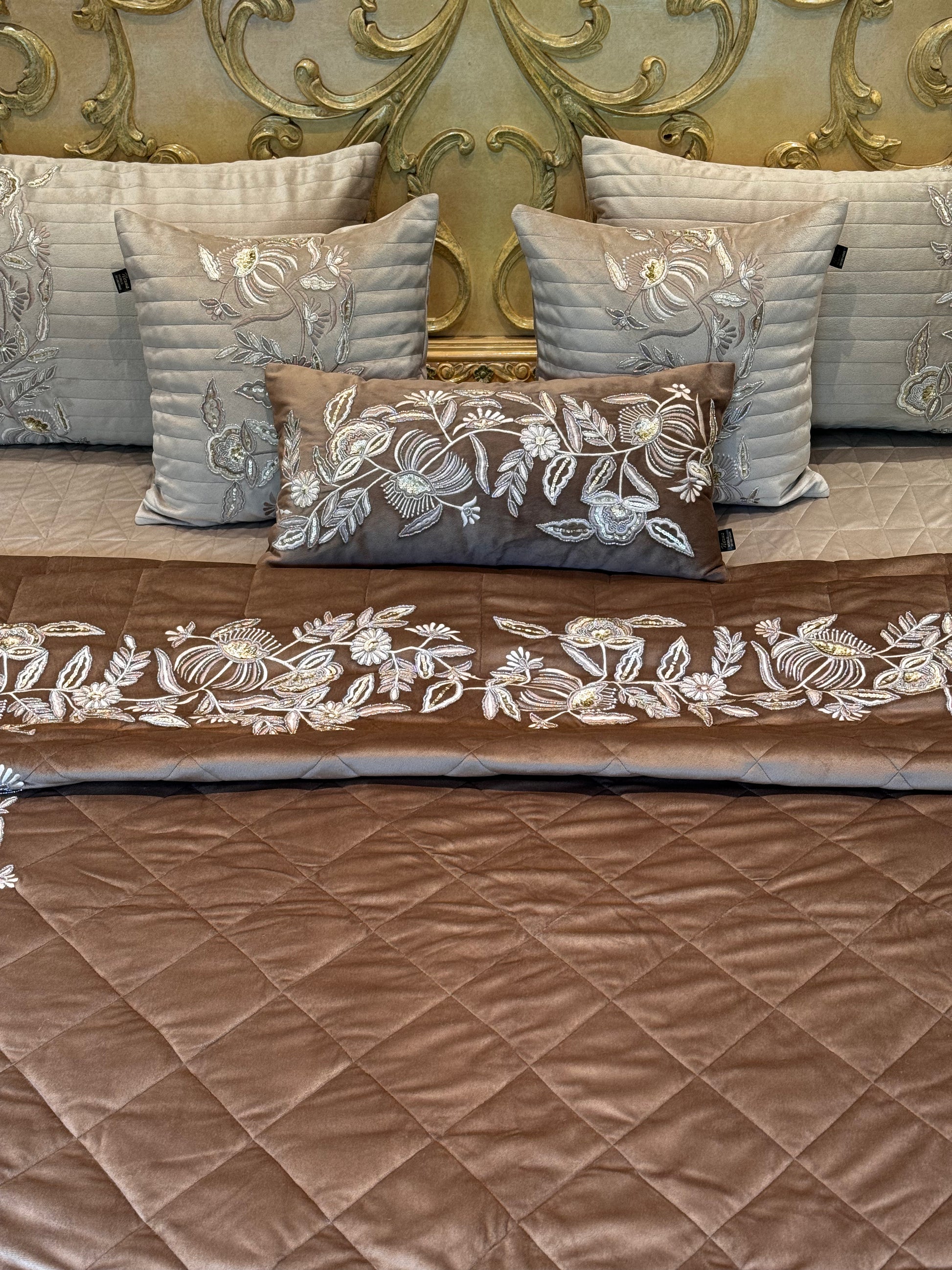 Indulge in luxury with our Brown Orchid Quilt Set. Each piece is hand embroidered with intricate detailing, adding elegance to your bedroom. The stunning embroidery is also featured on the pillow and cushion covers, creating a cohesive and stunning look. Upgrade your bedding with this elegant and gorgeous set.