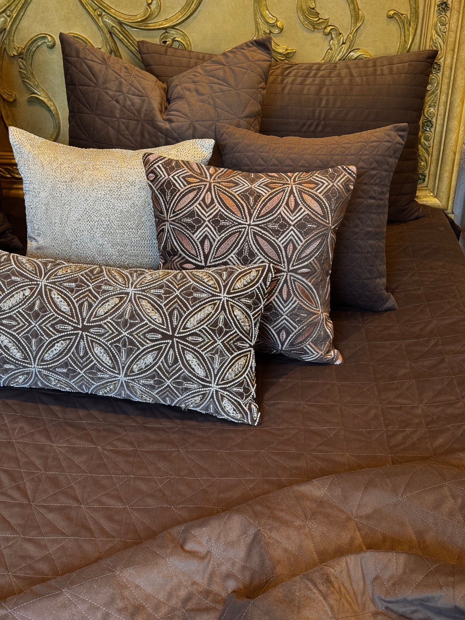 Intricate geometric embroidery on the accent cushions enhances the look with refined texture, while the quilted layers create a cosy, inviting setting. Designed for relaxed luxury and everyday indulgence, this bedding set transforms your space into a warm, elegant retreat—perfect for those who love grounded hues and effortless sophistication.