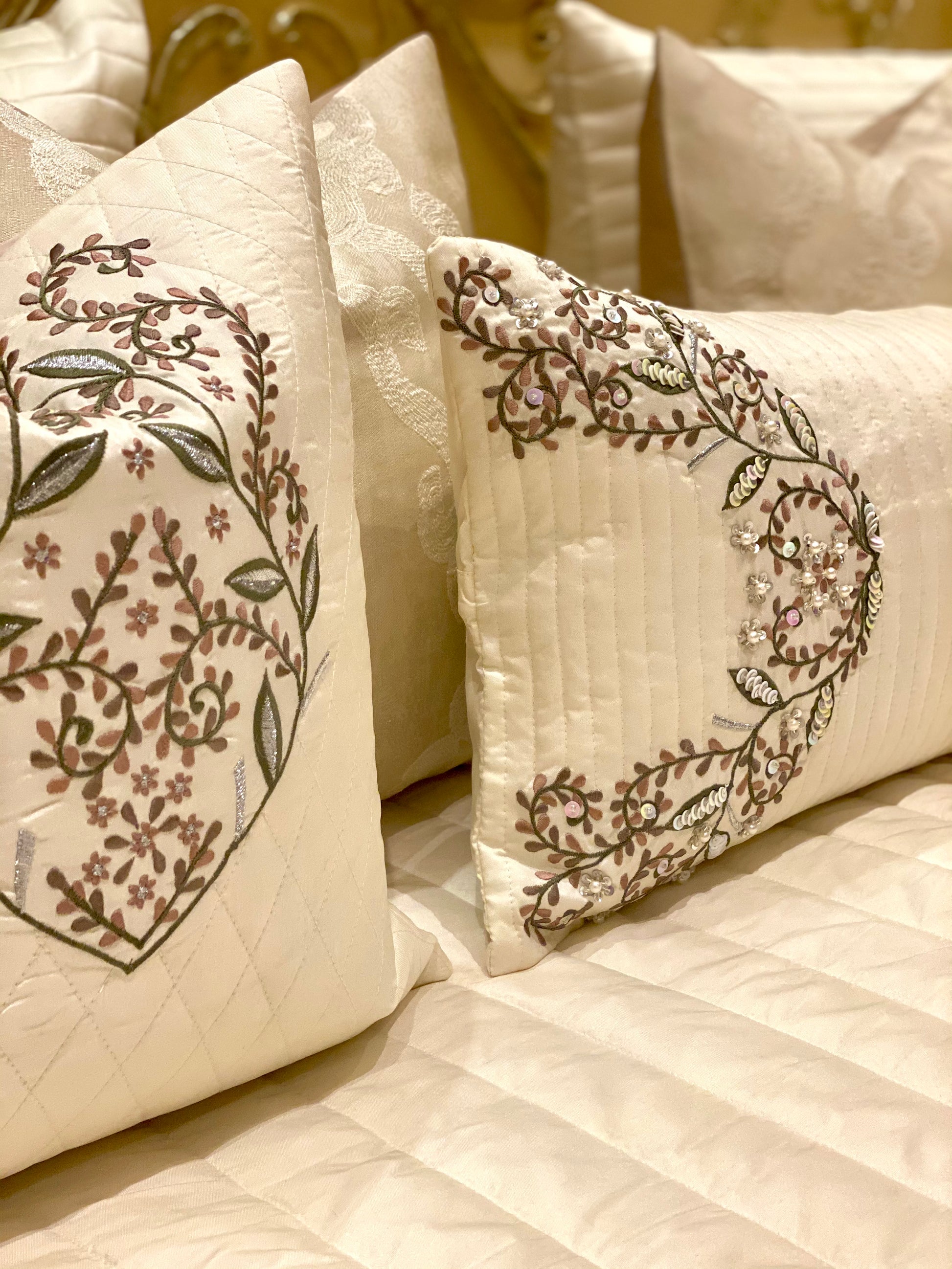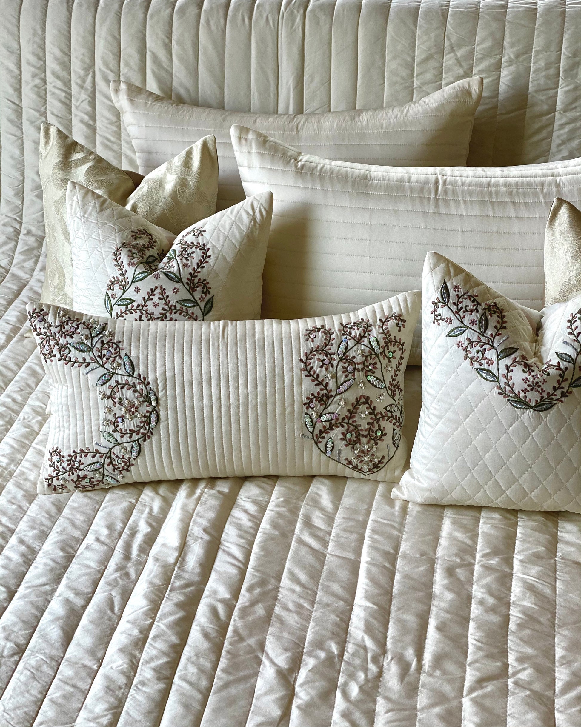 The Ella bedding set is a gorgeous pick for your homes with tasteful embroidery on the cushions & spine creating a luxurious & elegant set up✨ Invite a sophisticated silhouette to your bedrooms with this subtle bedding set!