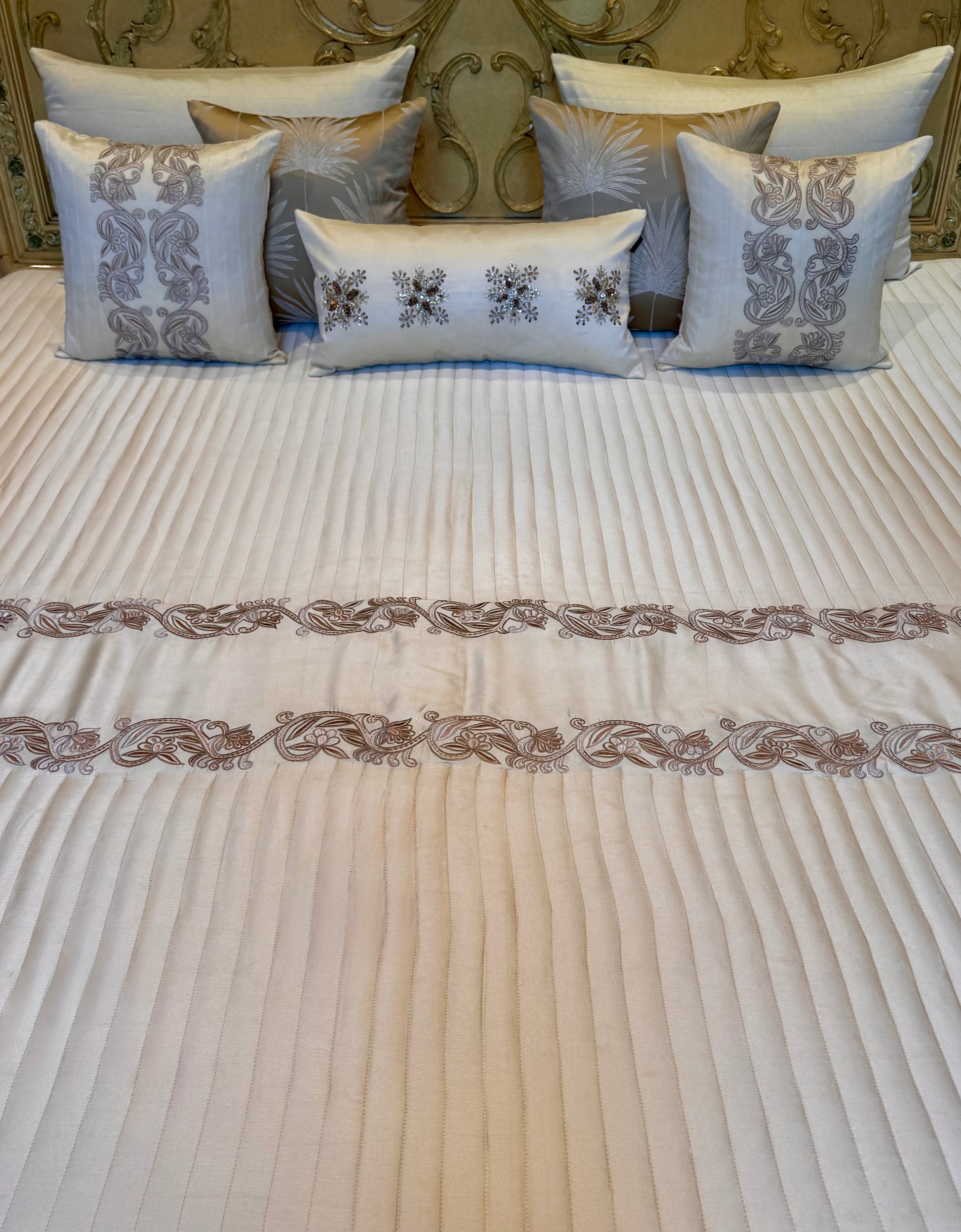The Cream Fleur Bedding Set is crafted from luxurious soft faux silk, offering a smooth and comfortable feel that enhances your sleep experience. Its elegant embroidery adds a refined touch of sophistication, making it a stylish centerpiece for any bedroom. This set combines durability with aesthetic appeal, providing both long-lasting quality and timeless elegance. Ideal for those who appreciate fine craftsmanship and subtle luxury in their home décor.