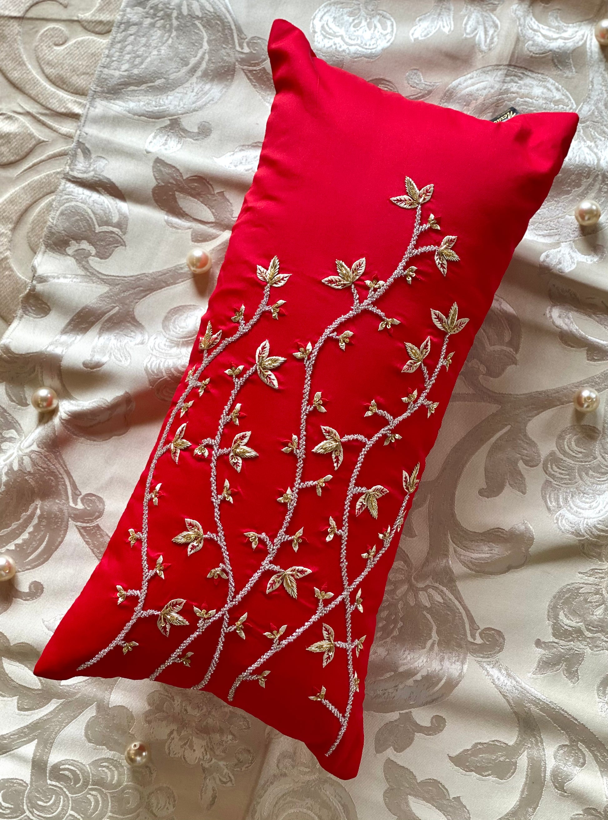 Adorn your sofa with this luxurious hand-embroidered spine cushion. It features a soft crimson colour with gold highlights, perfect for creating a warm, inviting atmosphere. With its exquisite details, it is sure to bring a touch of glamour to any space.