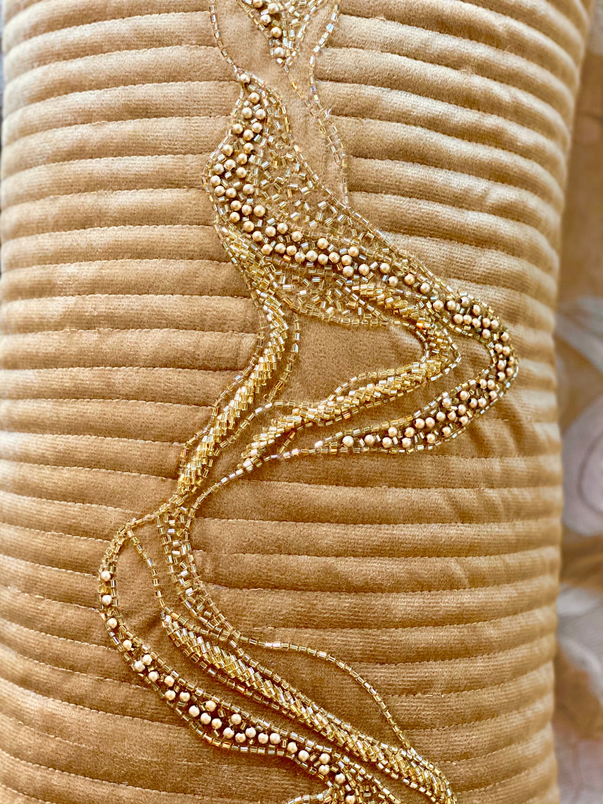 THE GOLD MOLTEN SPINE (WITH INSERT) is an exquisite piece with luxurious gold suede fabric creating a striking look for your homes. Crafted with handwork and an exquisite design, it is the perfect addition to any space.