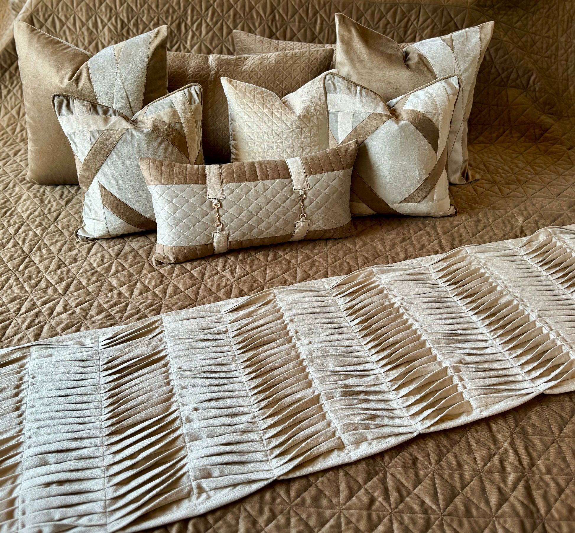 An exquisite bedding set that looks elaborate as ever with its modern pleated bed runner and graceful buckle detailing on the spine! Perfect for a subtle yet grand look✨