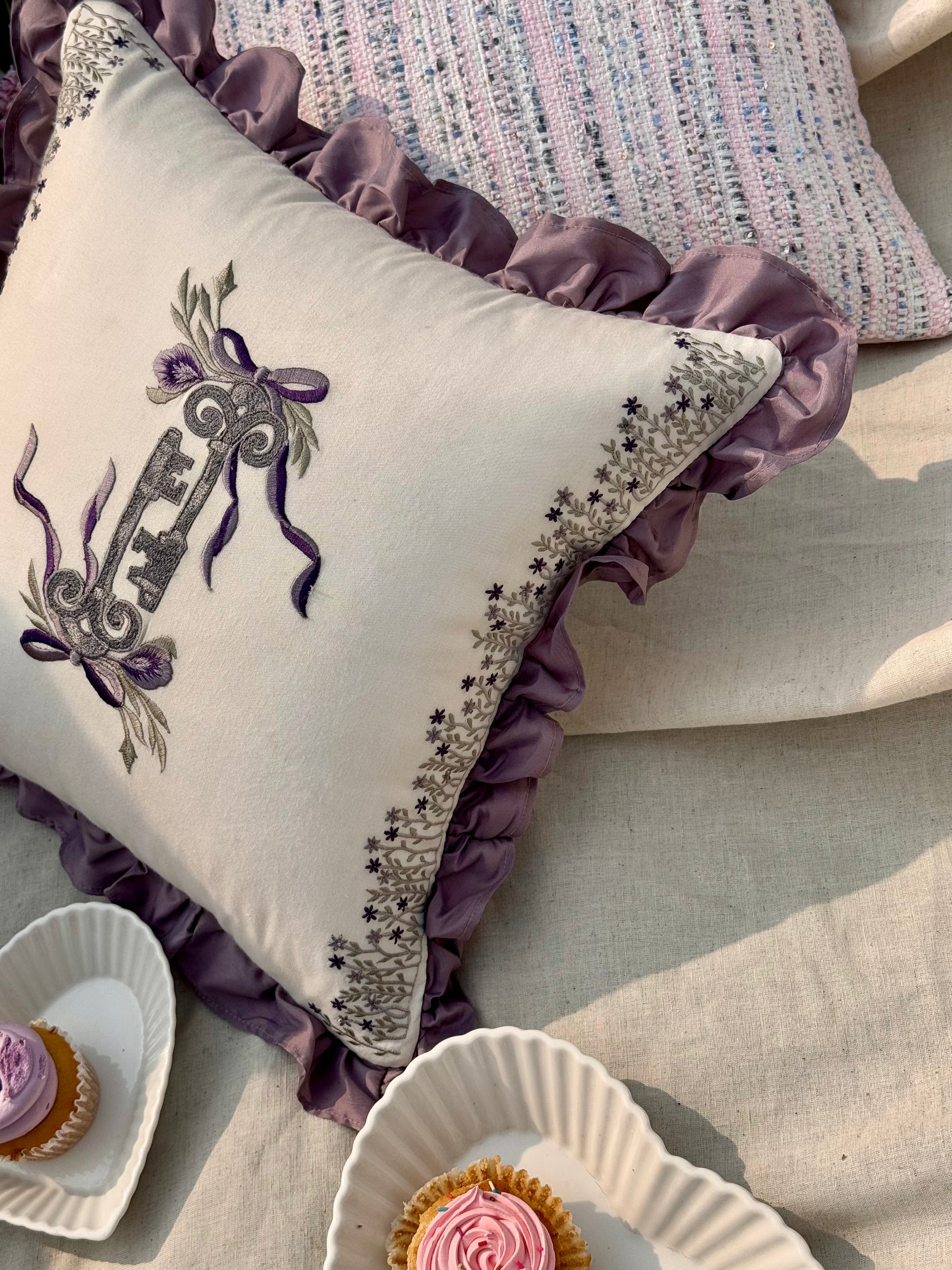Introducing the perfect accent to any room - THE KEY TO MY HEART CUSHION. With beautiful and subtle embroidered details, this cushion adds a pop of color and sophistication to any space. Its frill details add a touch of elegance, making it the perfect decorative piece.