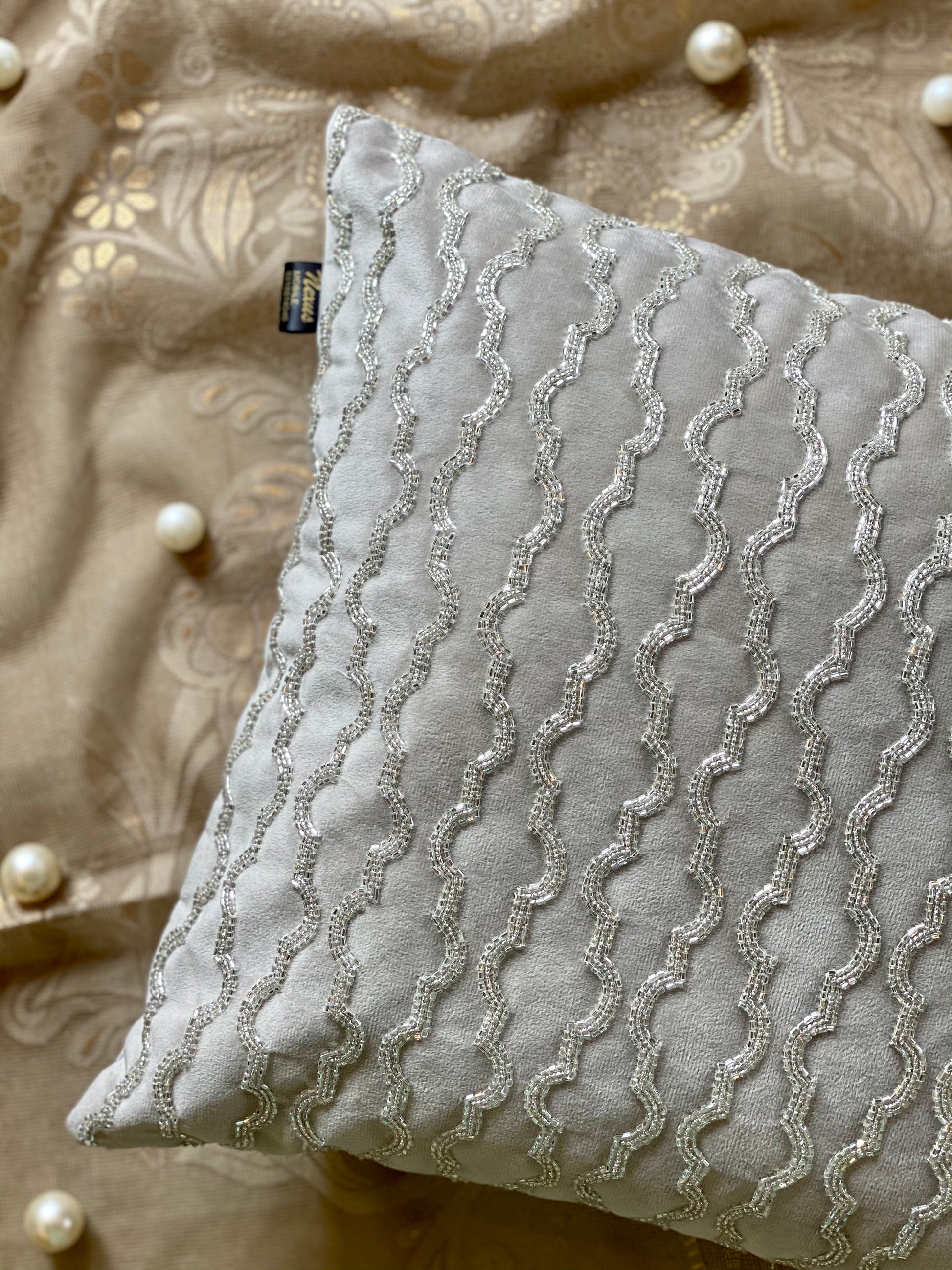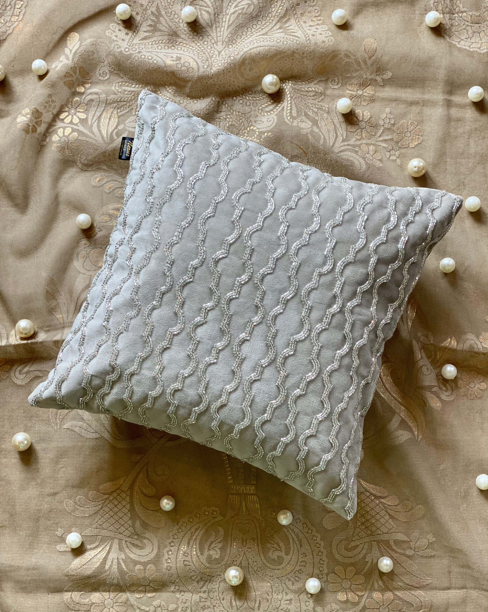 This gorgeous cushion cover features stunning glass bead hand embroidery on a soft suede fabric, making it a modern and stylish addition to any home. Experience the elegant texture of the glass bead embossment on the grey fabric, perfect for the fashion-forward interior.