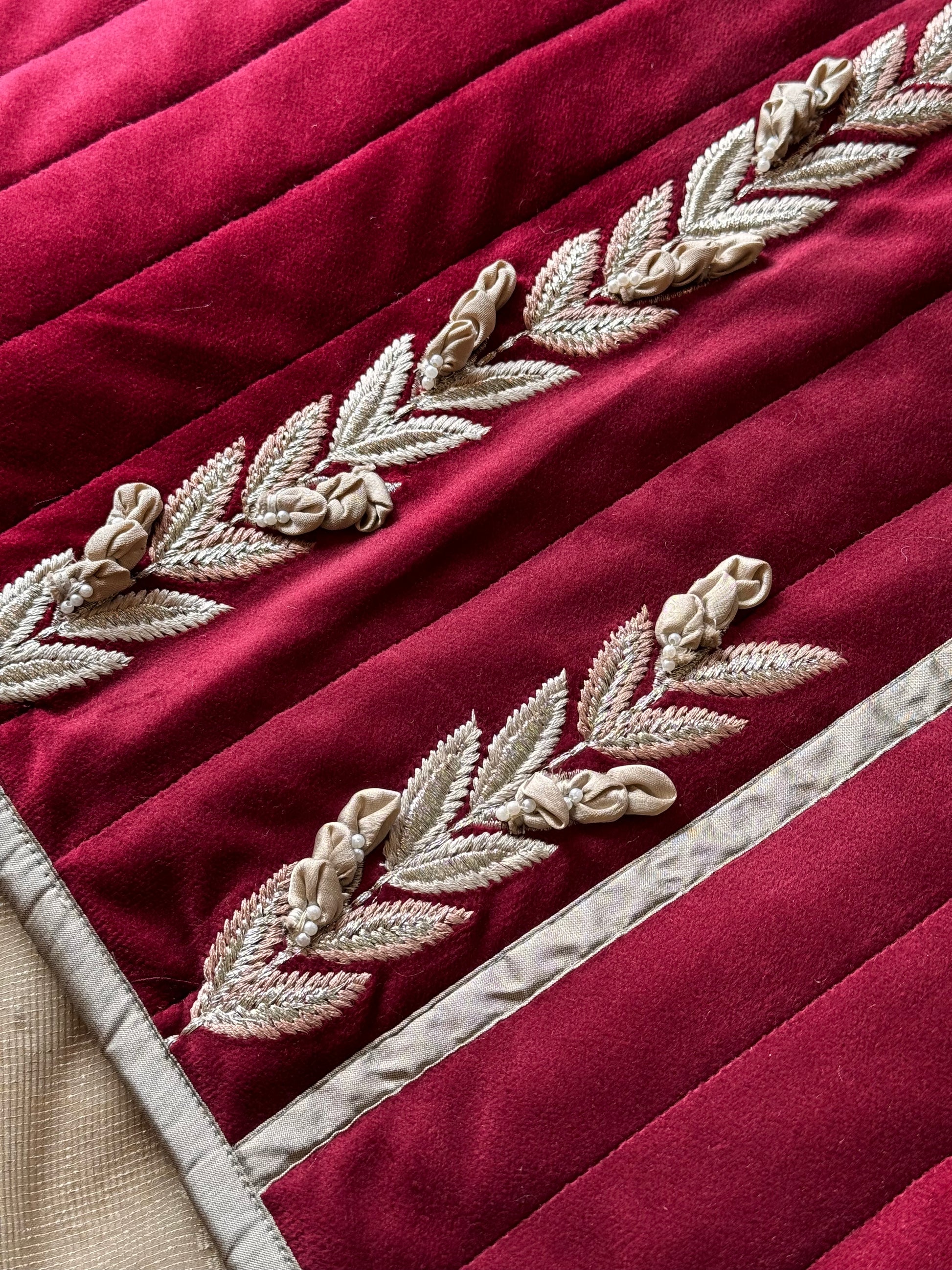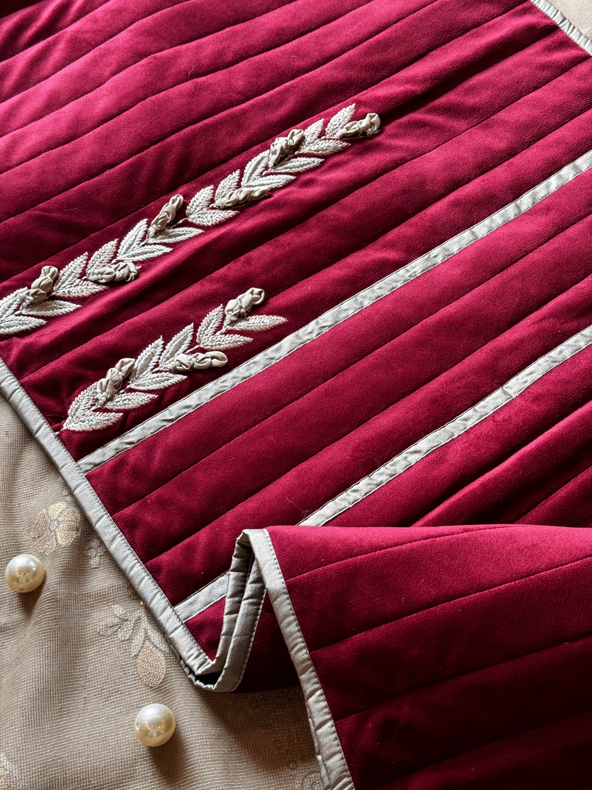 Upgrade your bed with our Maroon Spectra Bed Runner. Made with luxurious suede fabric and featuring intricate 3D hand work, this removable bed runner will elevate the look of any plain bedcover. Add a touch of elegance to your bedroom with this gorgeous addition.