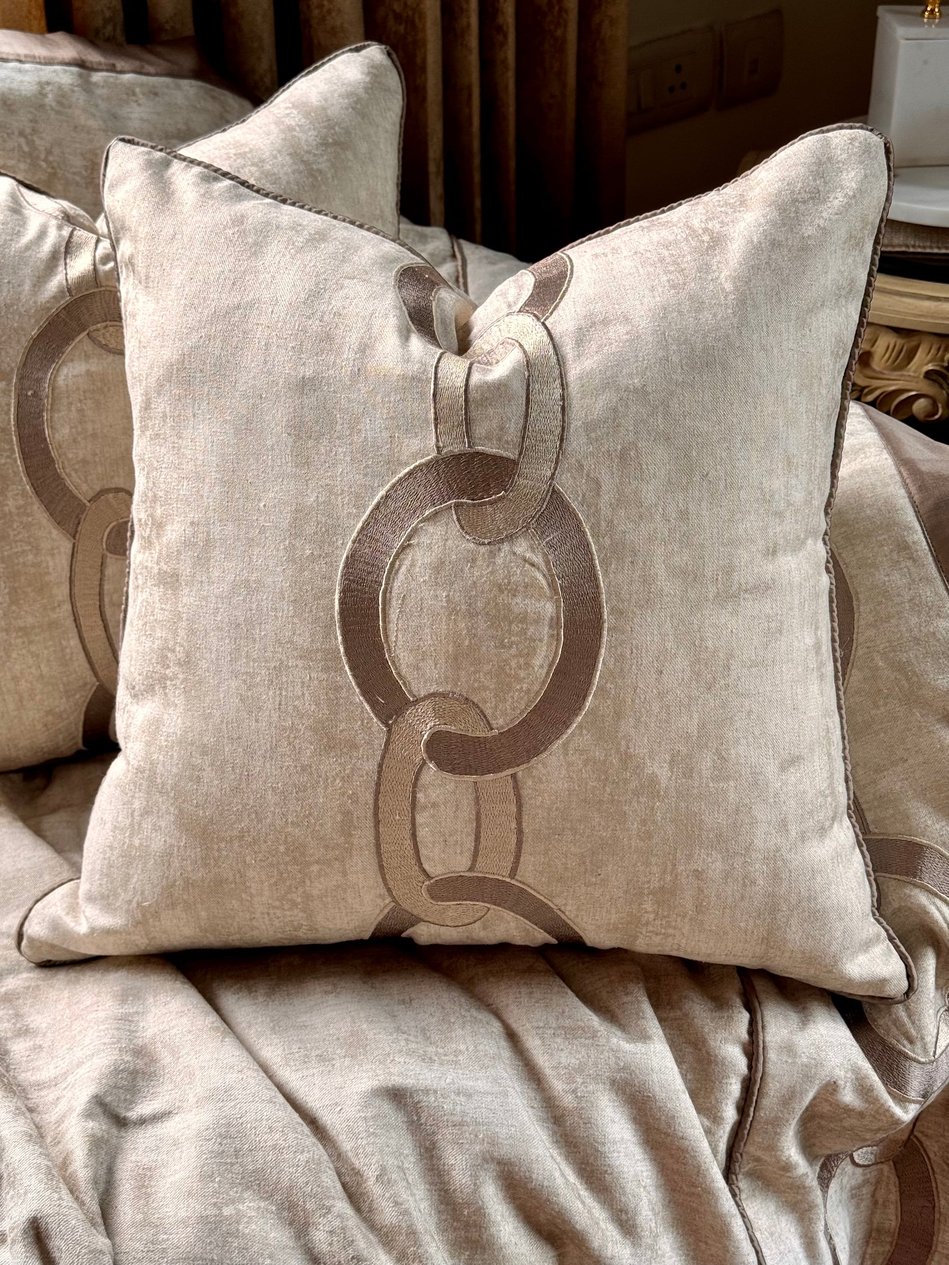 A refined accent for the discerning space, the Monarque cushion cover is crafted from luxurious textured silk and finished with smooth faux silk piping for a polished touch. Featuring modern chain-link embroidery on the centre, it mirrors the elegance of the Monarque throw while standing beautifully on its own. Sophisticated yet versatile, it layers effortlessly into both classic and contemporary interiors — adding depth, texture, and quiet luxury to any setting.