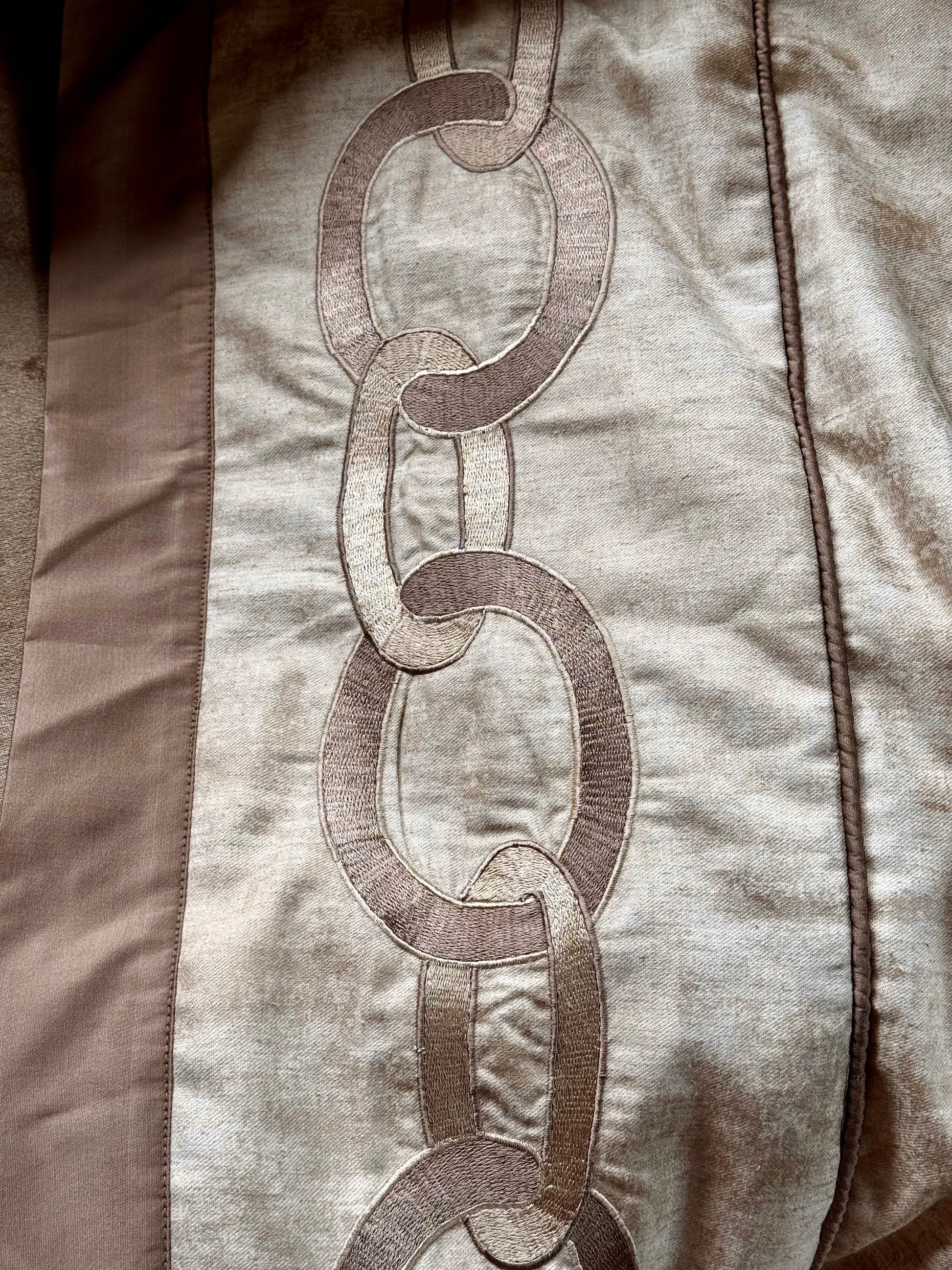 Elevate your living space with Monarque — a statement throw crafted in richly textured fabric and finished with lustrous faux silk borders. Designed for those who appreciate understated luxury, this throw features modern chain-link embroidery on both sides, creating a perfectly balanced drape. The contemporary detailing adds depth and sophistication, making it an exquisite accent for your sofa, chaise, or reading nook.