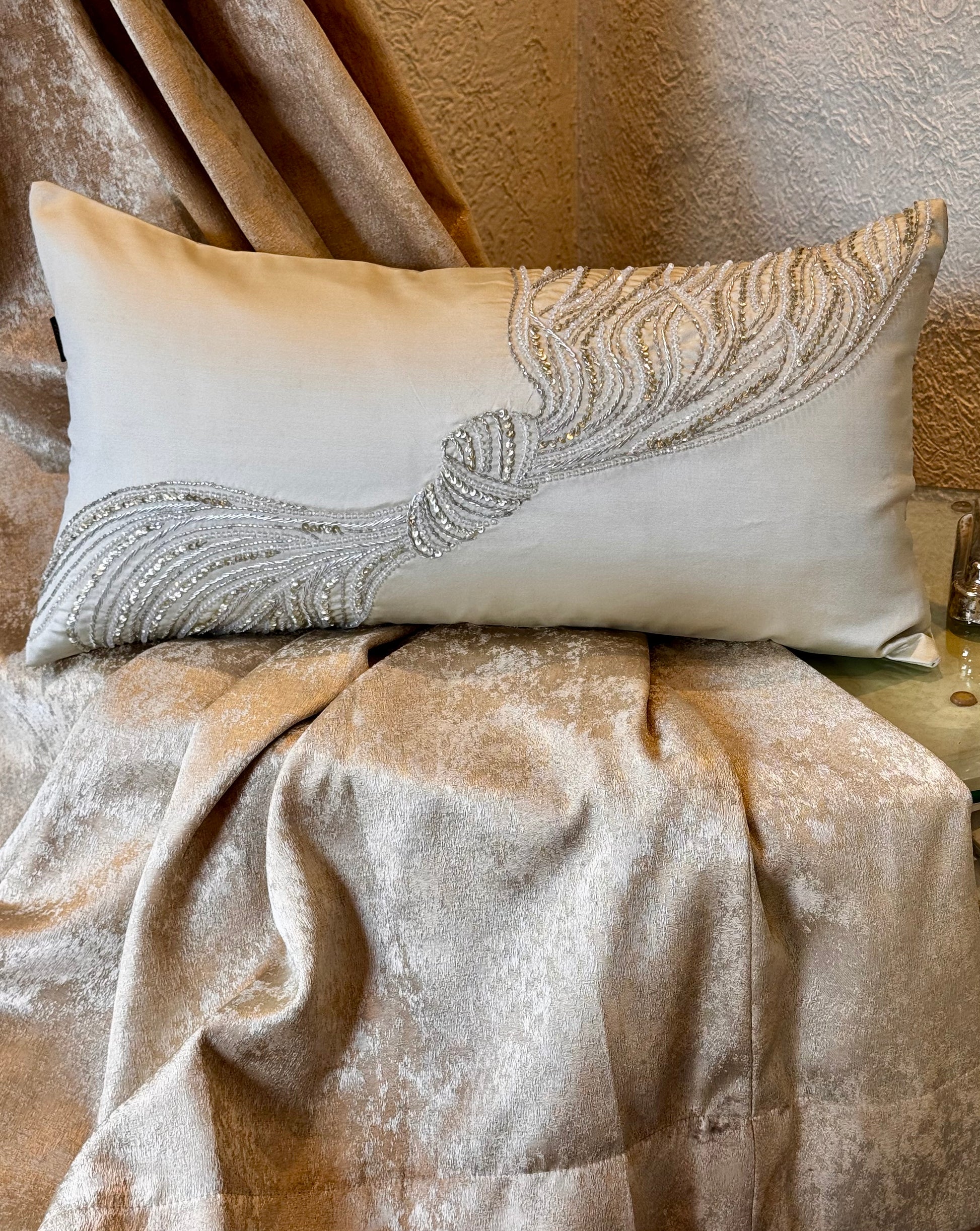 Elevate your interior with The Moonlit Lumbar, a sophisticated accent pillow featuring exquisite handcrafted detailing. This elegant lumbar cushion, complete with insert, adds refined support and visual interest to sofas, beds, or accent chairs. Its subtle design seamlessly integrates into various décor styles while making a distinctive statement through superior craftsmanship.