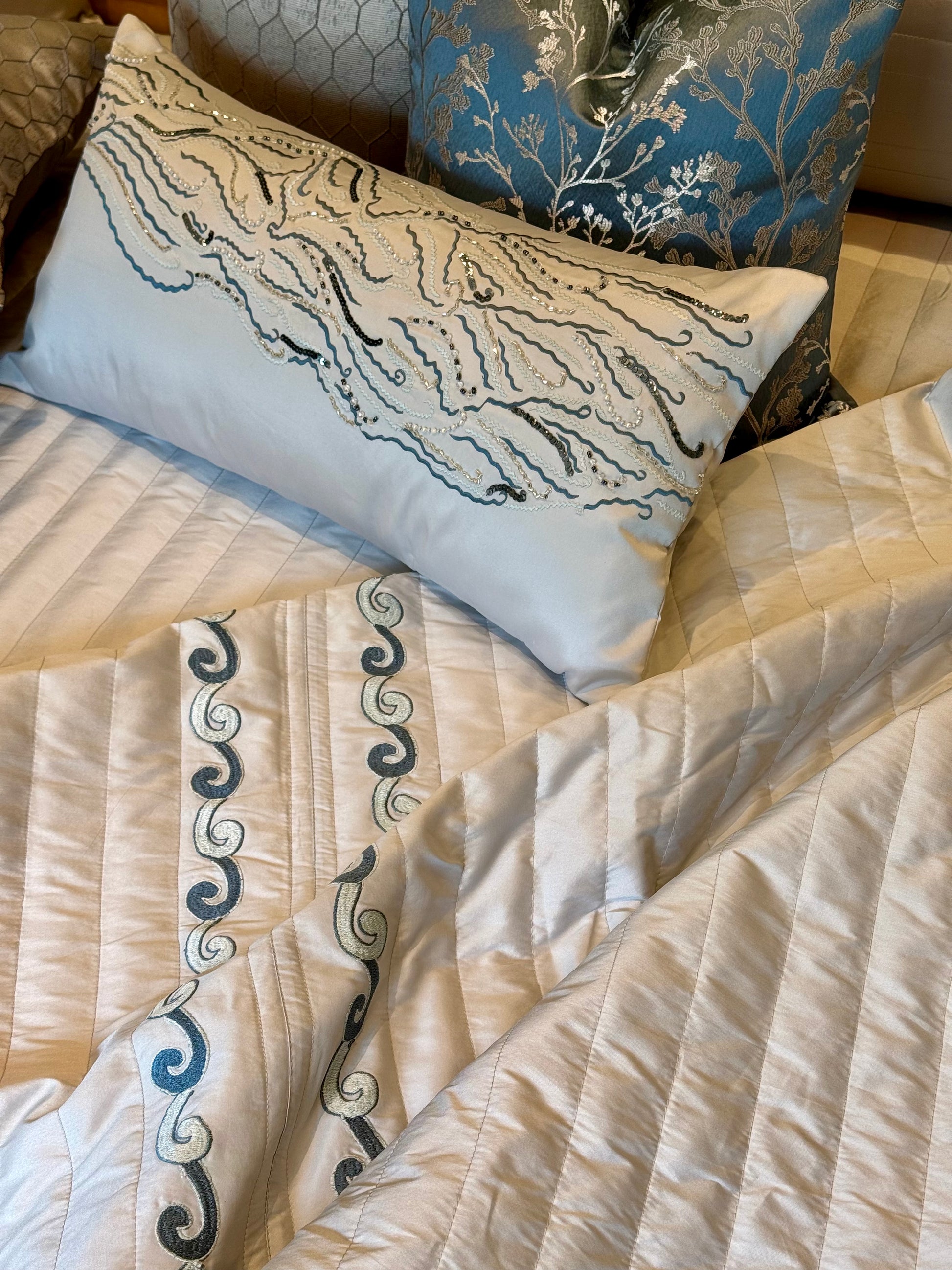 Bring home the calm of the sea with our Ocean Story Bedding Set, a serene blend of luxury and nature-inspired design. Crafted in a soft light grey tone, this set features delicate wave-like embroidery in shades of deep and icy blue, evoking the rhythmic beauty of ocean tides. The vertical quilted pattern adds structure and texture, enhancing the refined look while keeping the feel luxuriously soft and smooth.