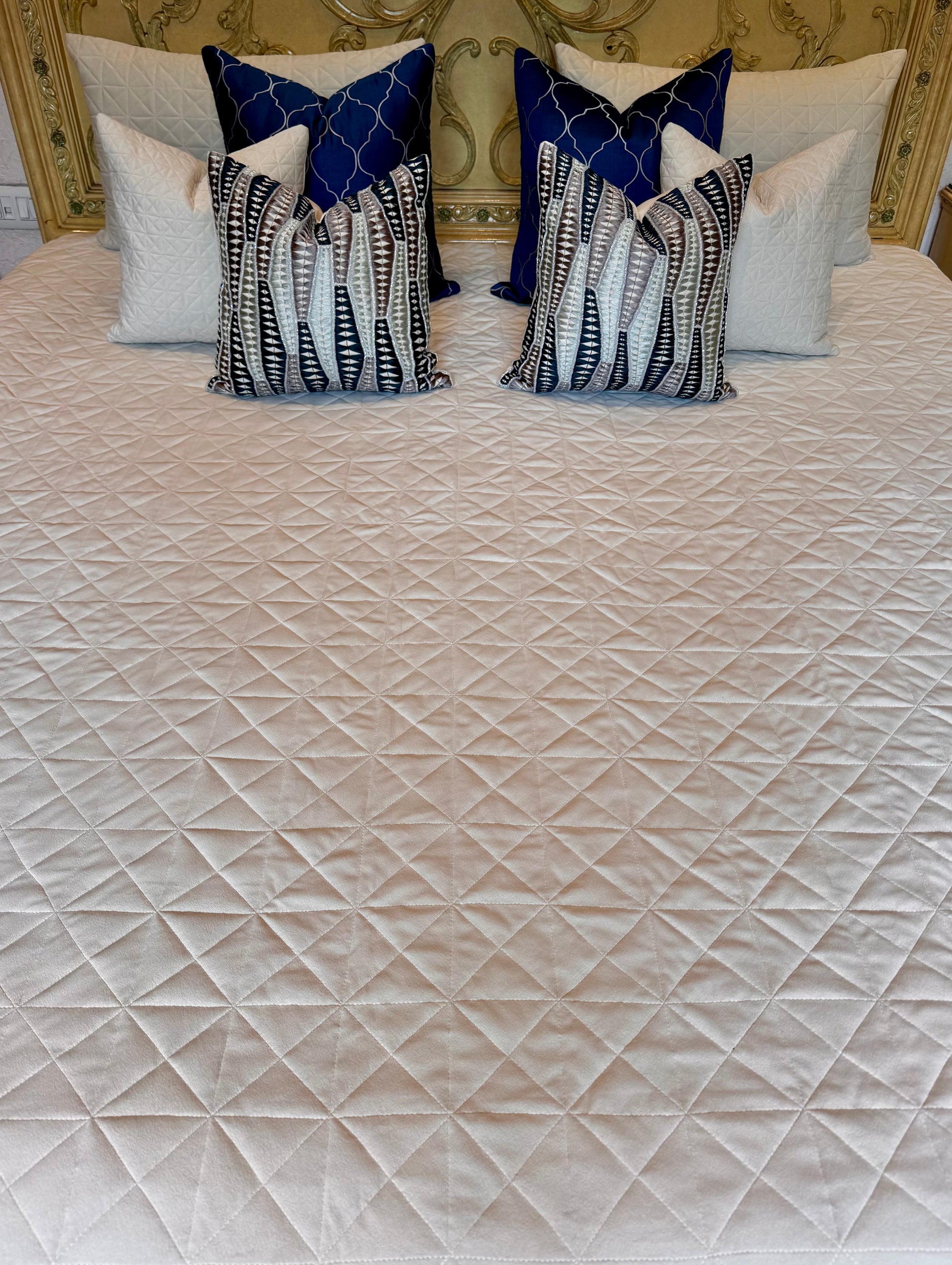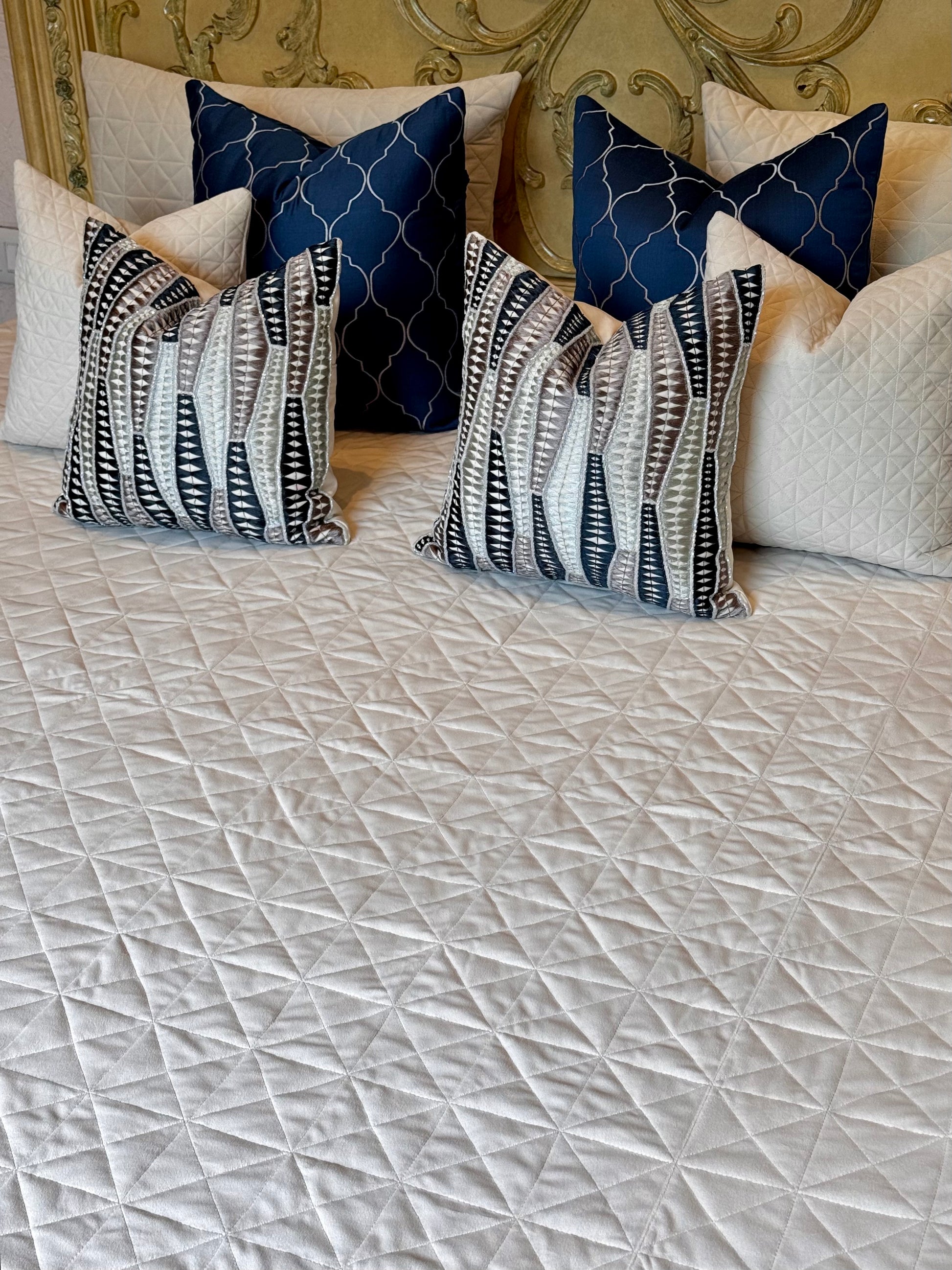 Layered with rich blue accent cushions, this set creates a beautiful contrast that enhances its serene palette, making your bed the focal point of a high-end, thoughtfully styled space. Whether in a classic or modern interior, Azra blends softness, structure, and luxury in perfect harmony.