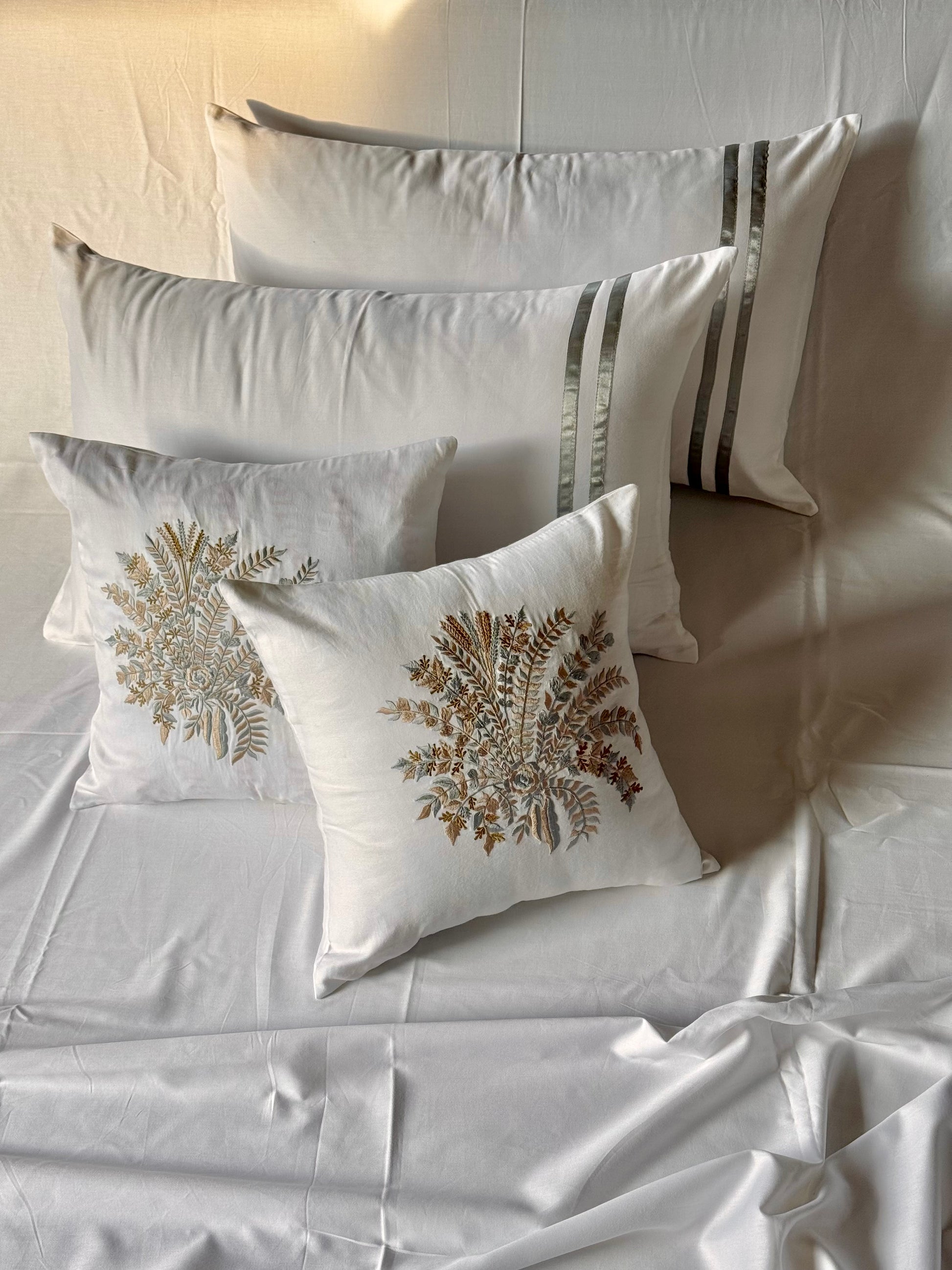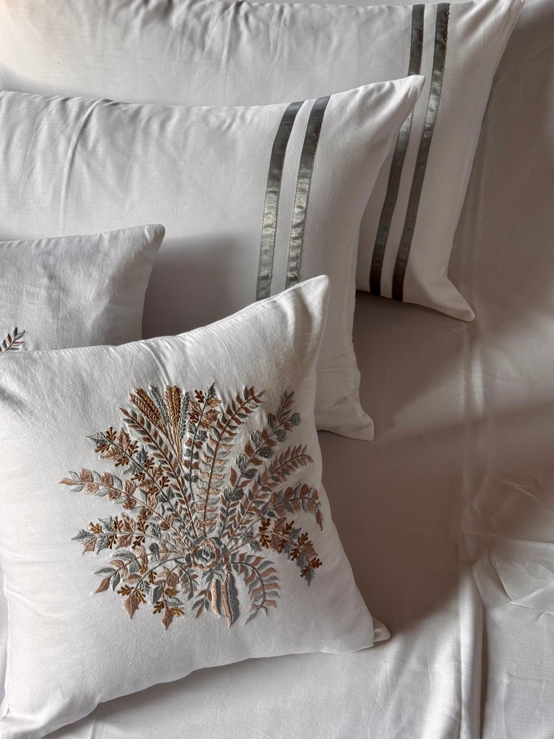 The set is beautifully accented with delicately embroidered cushion covers, adding a subtle touch of elegance and texture. Perfect for those who appreciate simplicity with a hint of sophistication.