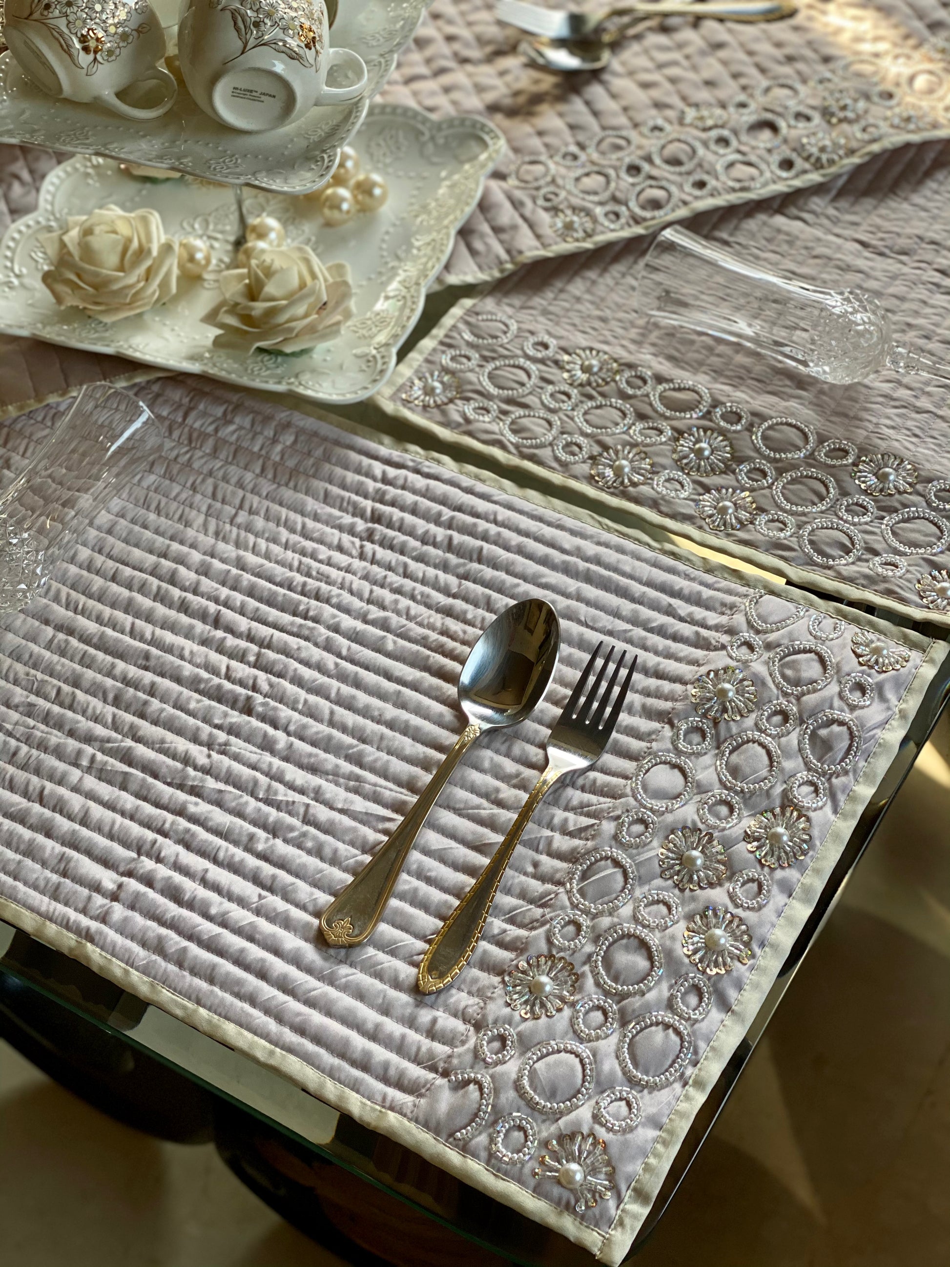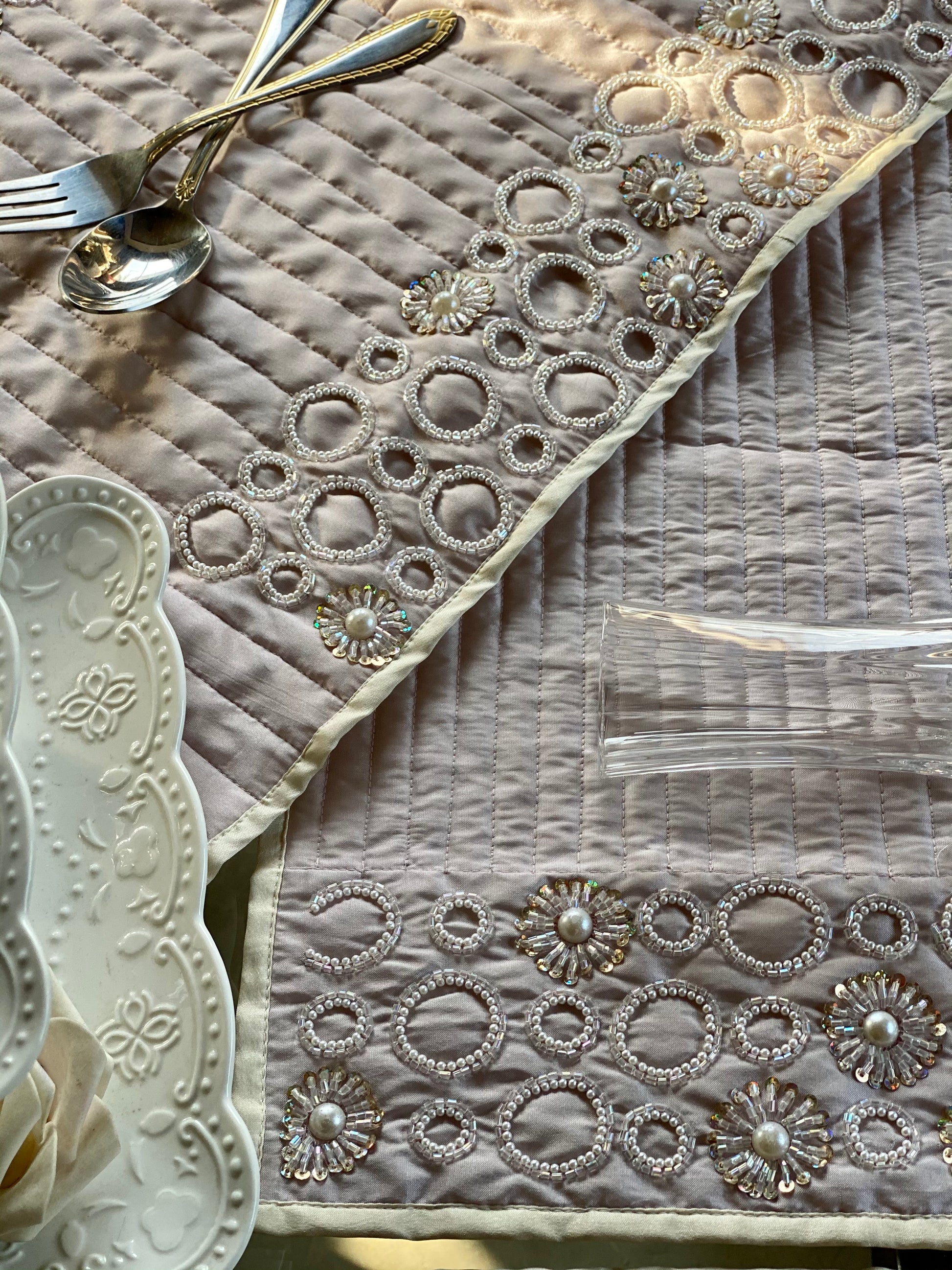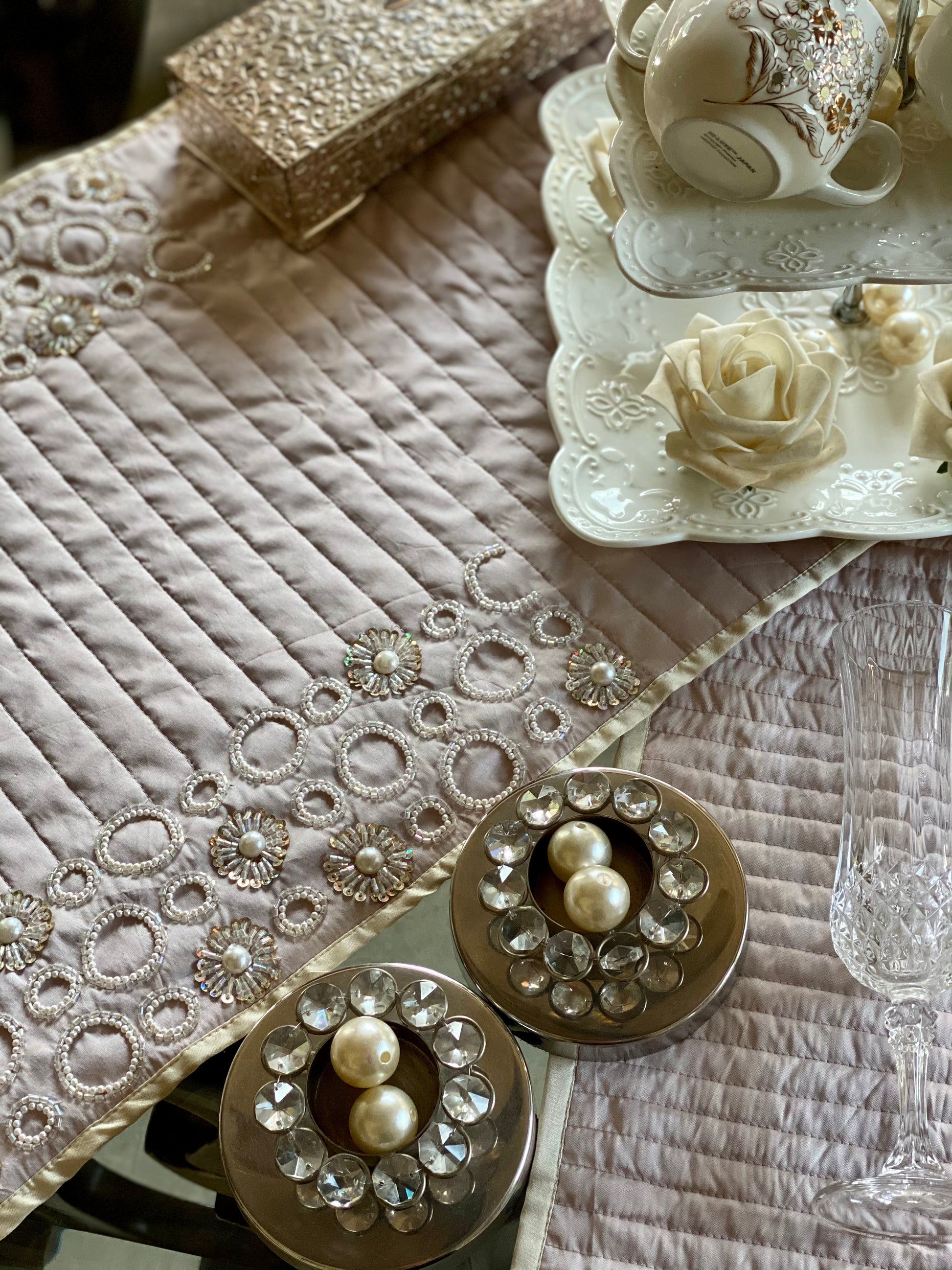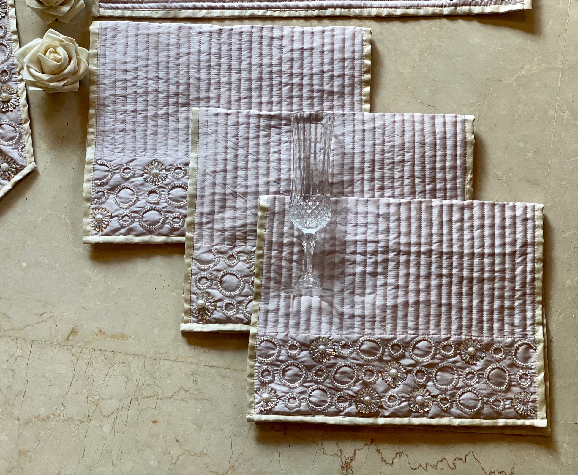 With dainty Pearl & cut work and intricate quilting style, this dining table runner & place mats set is a gorgeous accessory to style your homes for special occasions & dinners. The perfect blend of luxury & elegance to enhance your experience of dining at home.