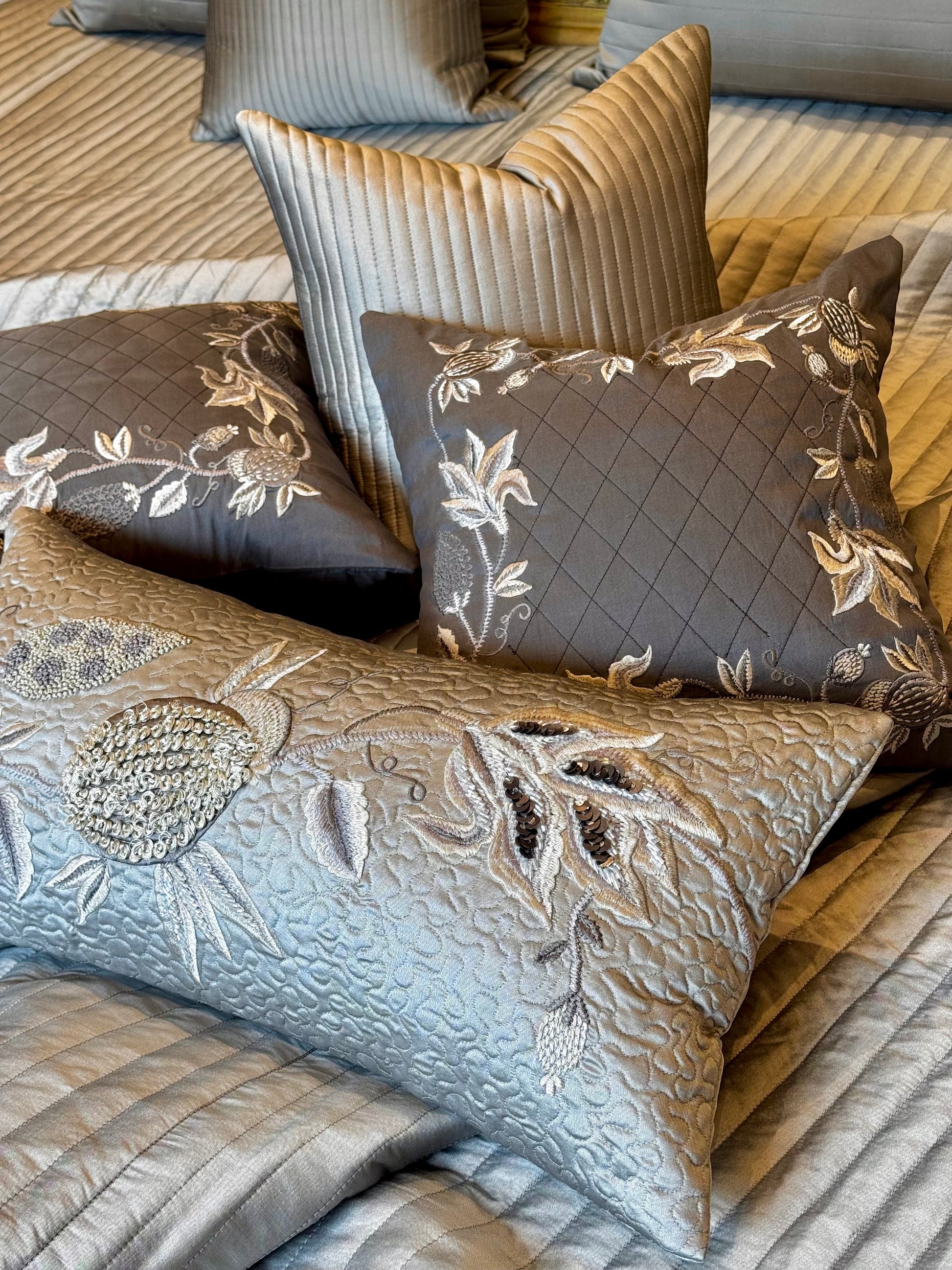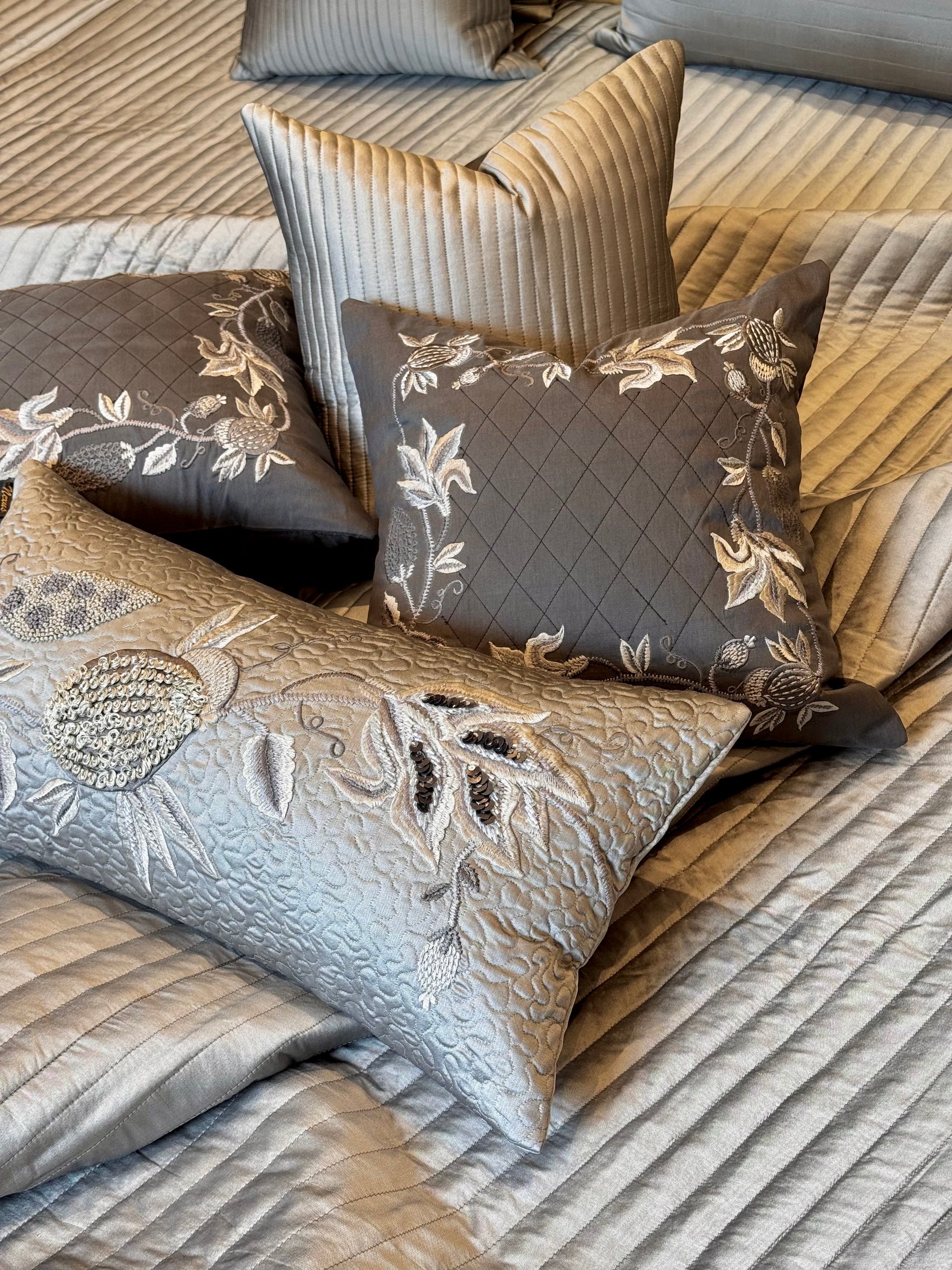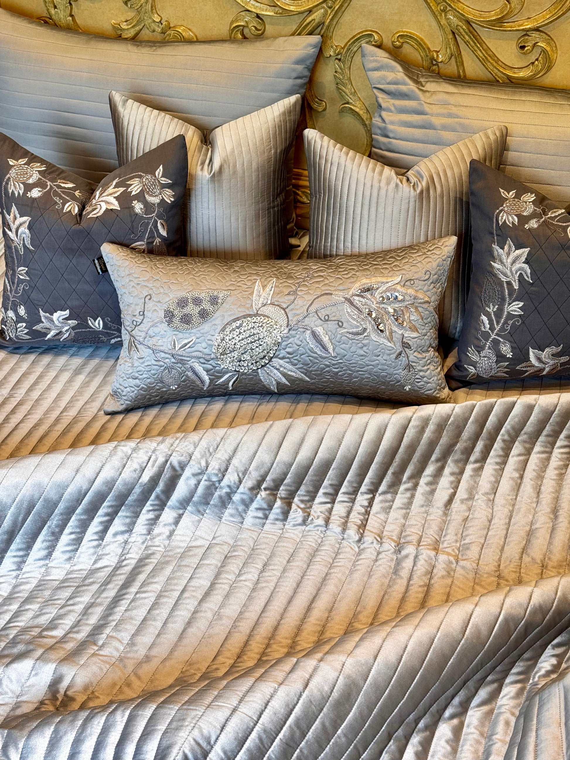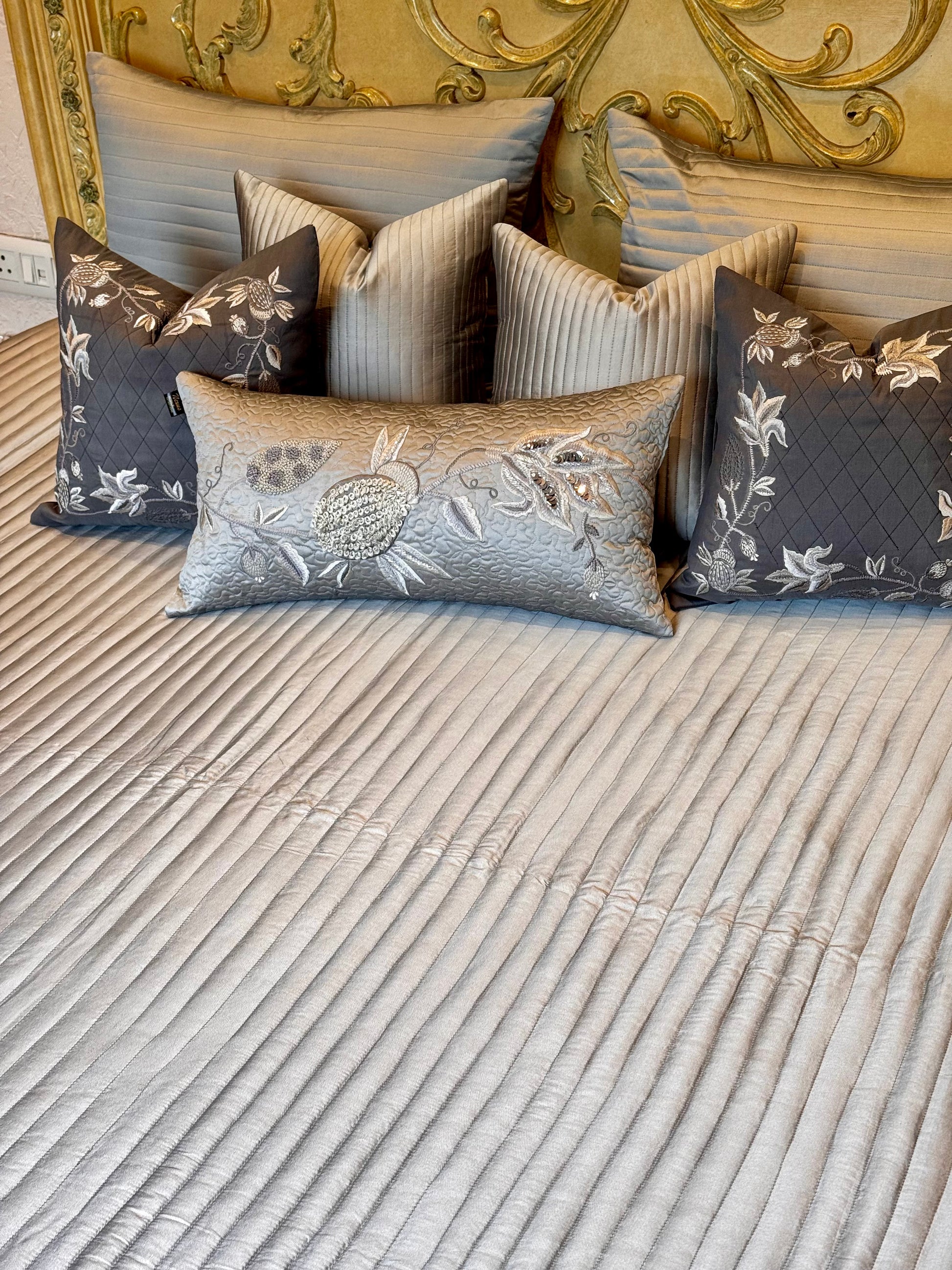 An enchanting tale of elegant textures paired with graceful designs to create a stunning bedding set that transforms your bed rooms into a peaceful haven! Soft hues of washed silver & grey make this set dynamic & suitable for all season use✨