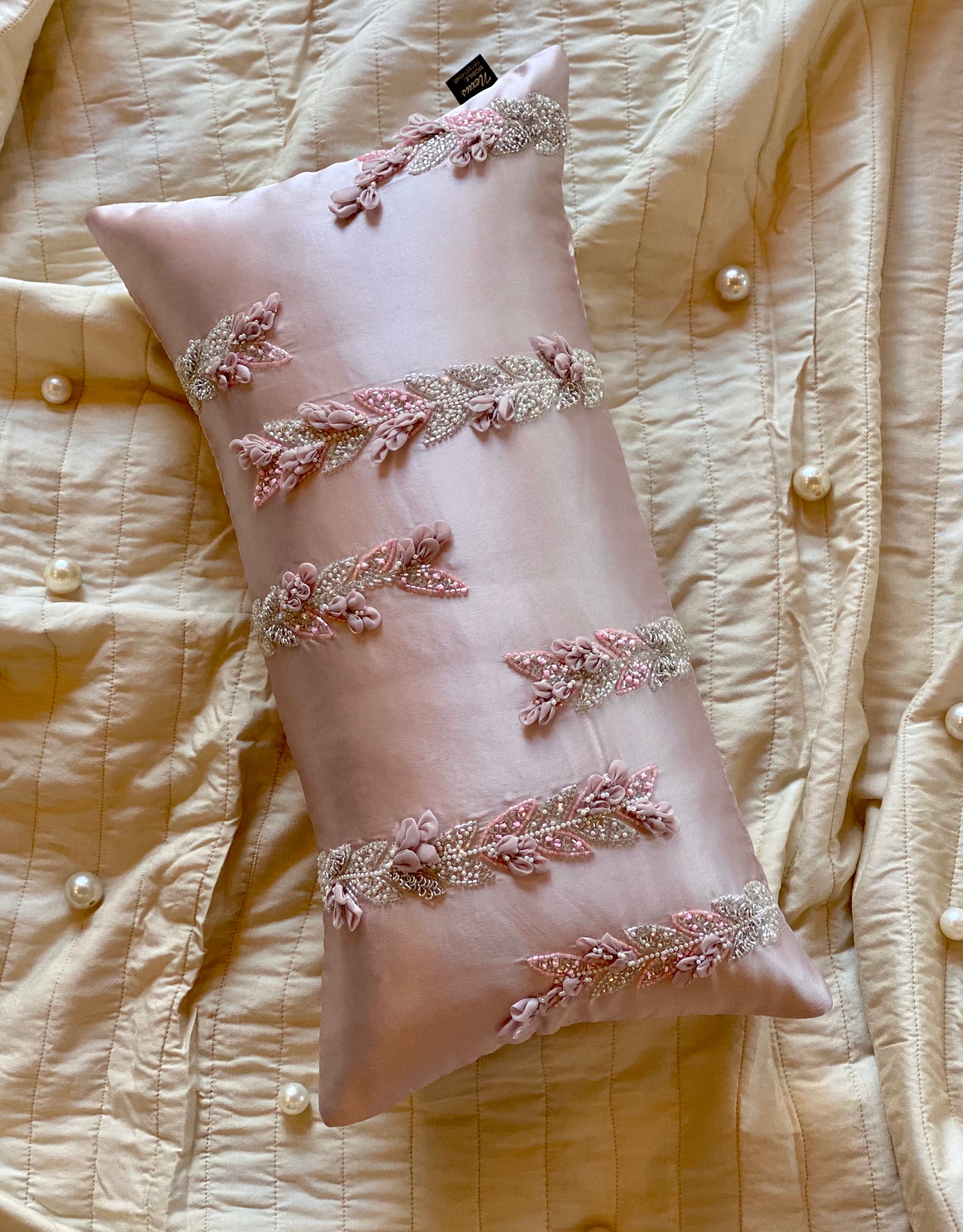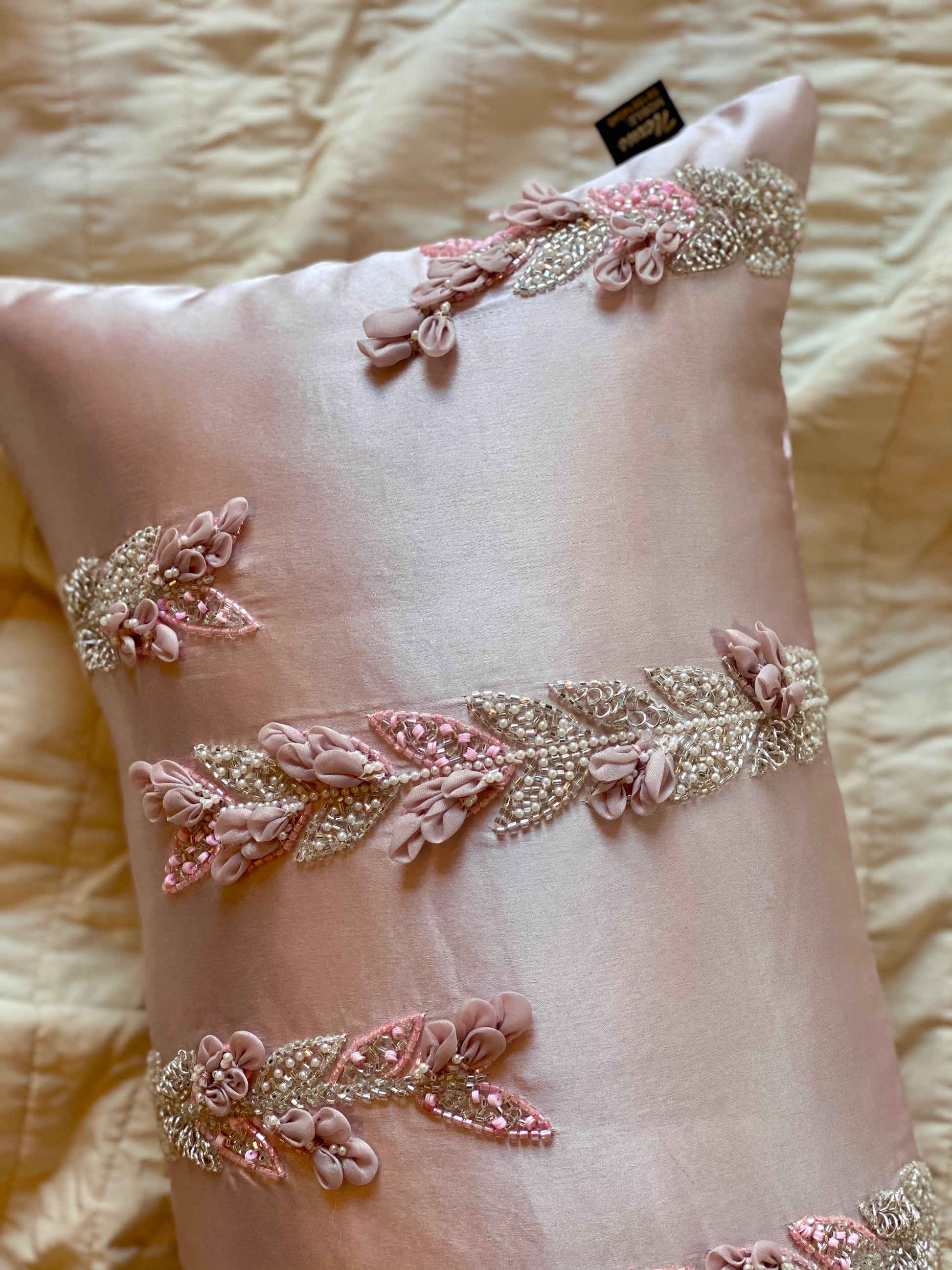 A luxurious affair of soft pink tones paired with the glamour of delicate hand work, this spine cover is a dream to place in your homes!