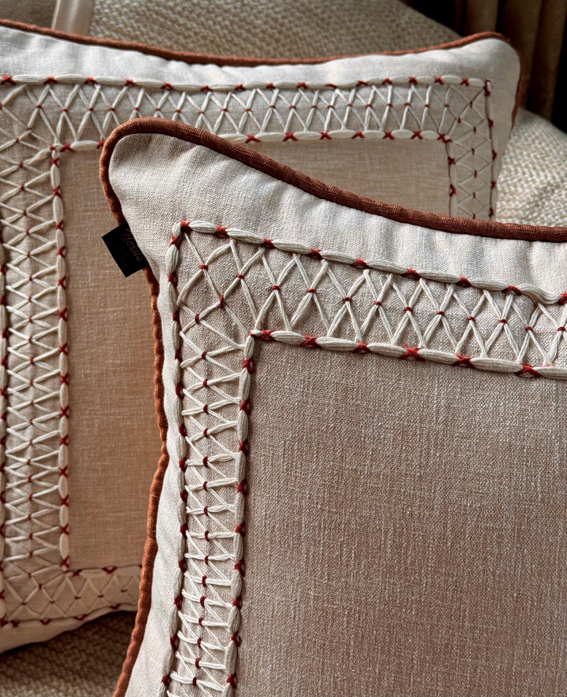 Crafted in soft, breathable cotton-linen fabric, this exquisite cushion cover is a true testament to artisanal finesse. The natural beige base is adorned with intricate hand-stitched cross-stitch embroidery in a warm terracotta hue, adding depth, texture, and timeless charm. Finished with terracotta piping for a tailored edge, it brings an understated sophistication to your living spaces. Perfect for layering on your sofa, bed, or reading nook, this handcrafted piece elevates comfort into an art form.