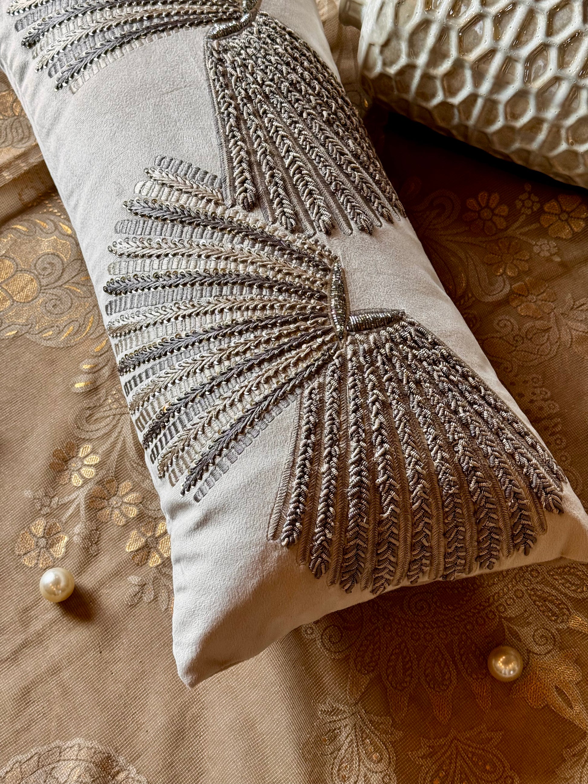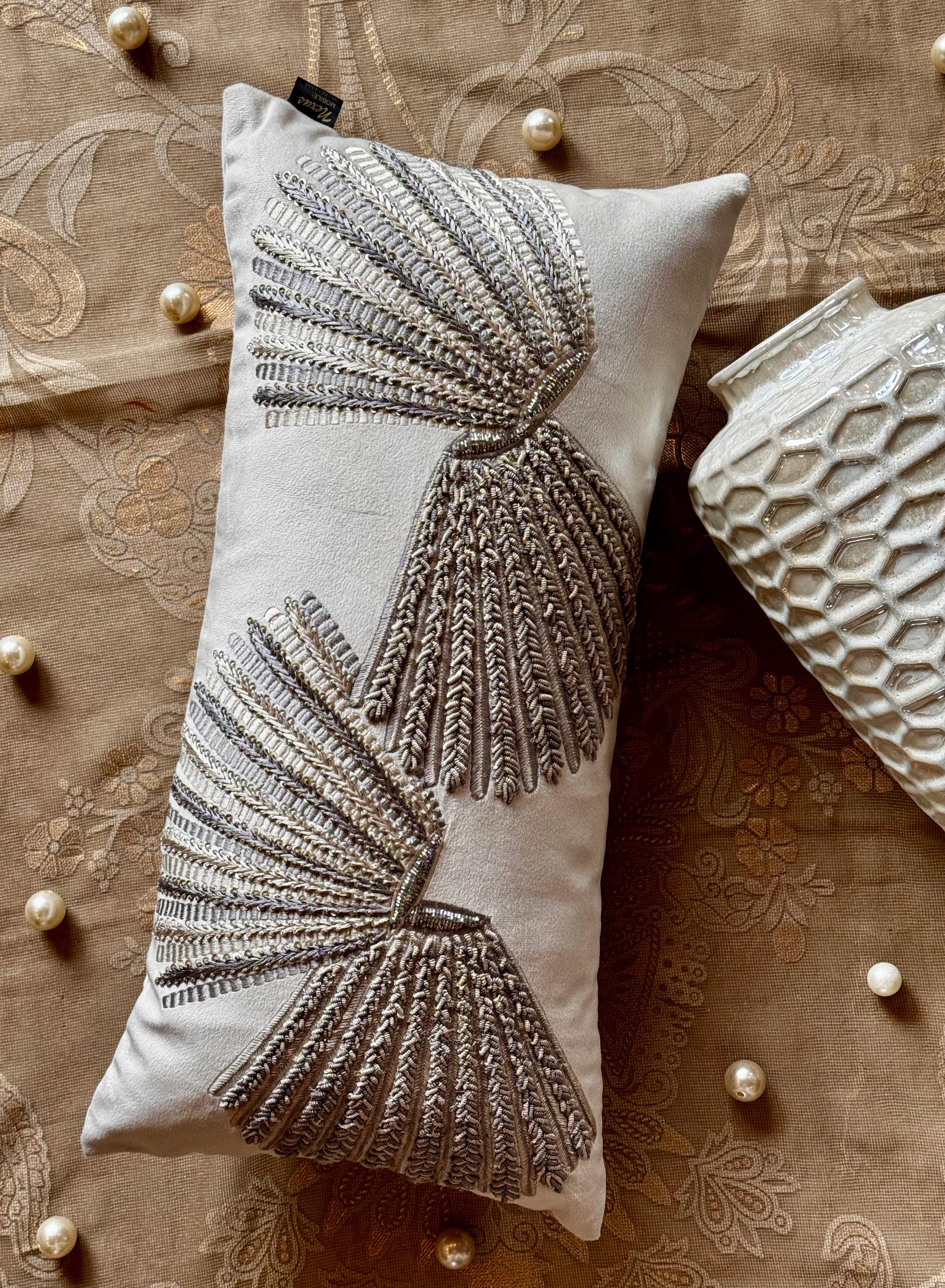 The Wellington Lumbar is a stunning addition to any home decor, featuring gorgeous hand embroidery done for over 40 human hours. The intricate knot and shading handwork adds texture and depth to this lumbar, making it a truly one-of-a-kind piece. Elevate your space with the Wellington Lumbar.