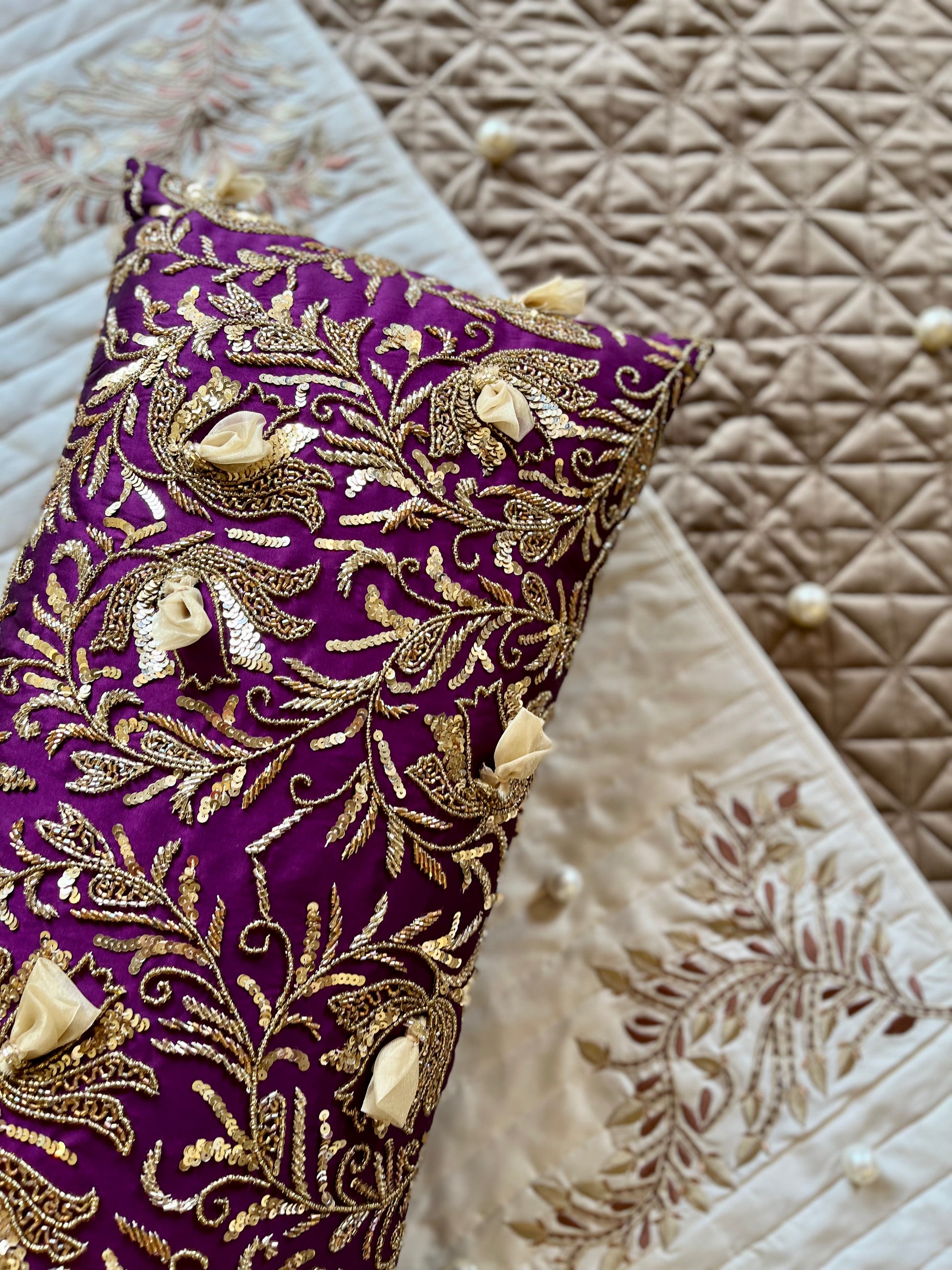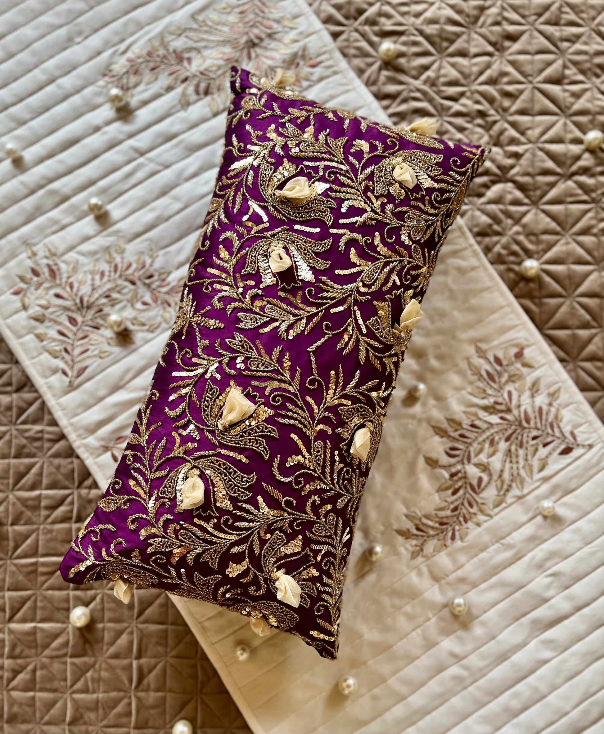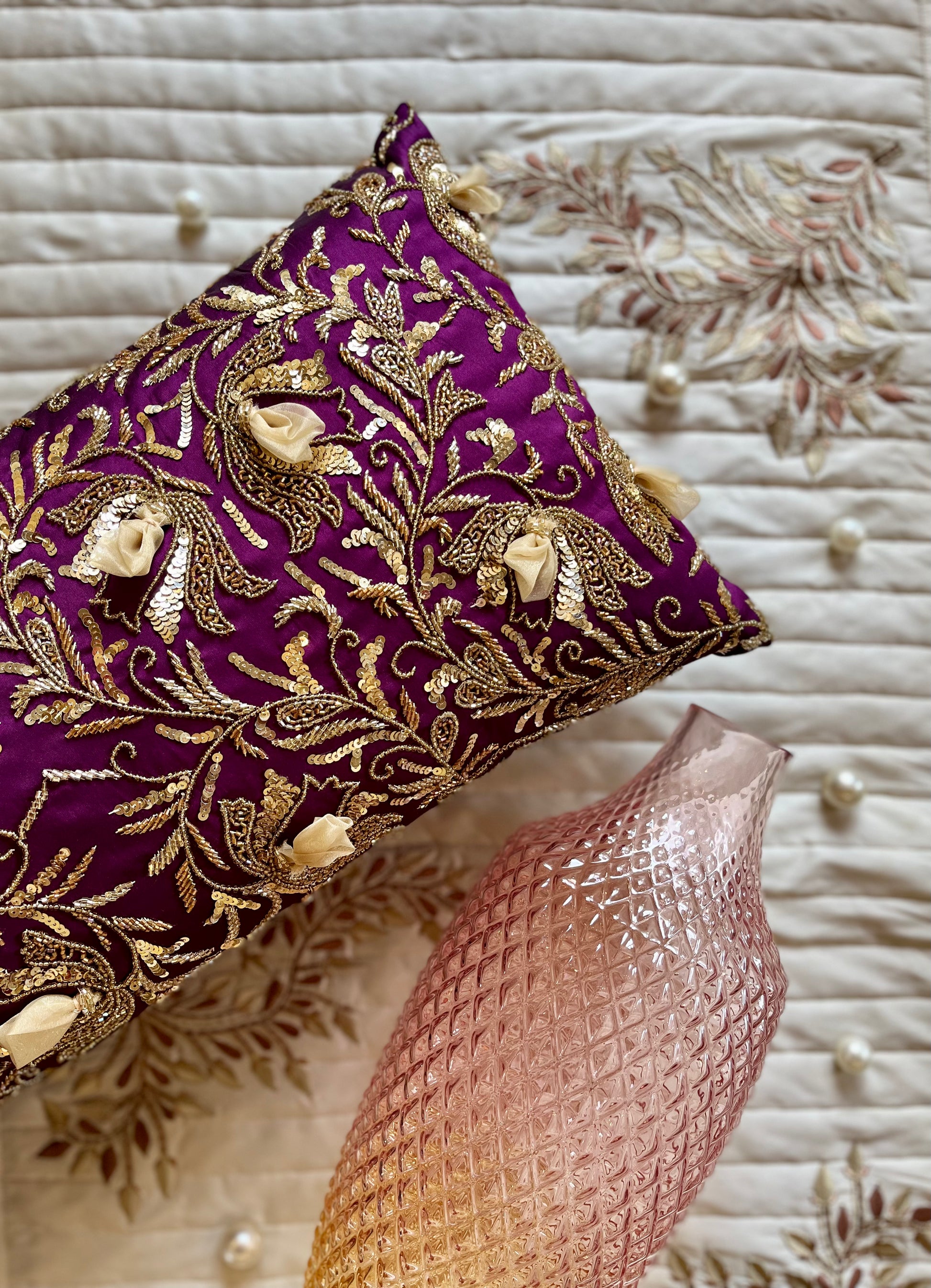 This luxuriously hand-embroidered cushion is the perfect decorative piece. Crafted with a wine and gold colour palette, its unique style will add a touch of elegance and sophistication to any room. The Wine Fleur Spine cushion with insert offers a luxurious look with an elegant feel.